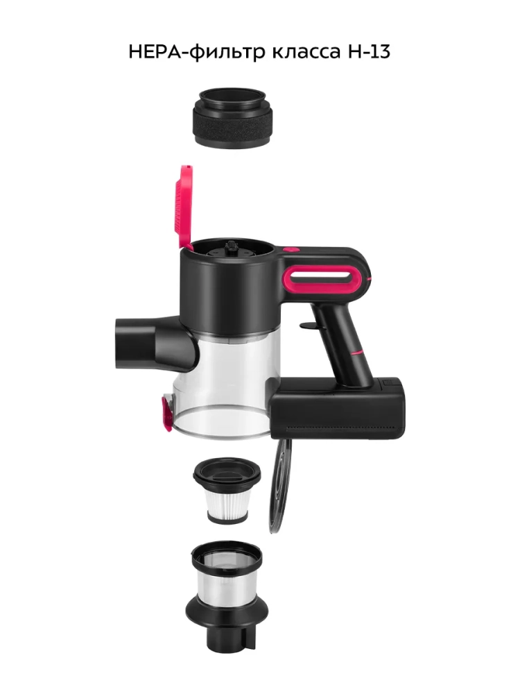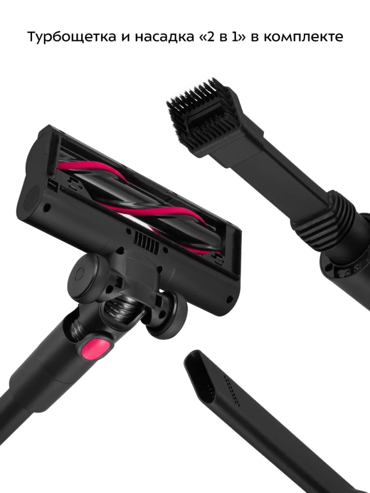 Ручной режим пылесоса позволяет легко очищать поверхности мебели, полки и даже салон автомобиля. В комплекте с пылесосом идут различные насадки, включая турбощетку, которые помогают эффективно удалять пыль и грязь с ковров и других напольных покрытий. Дополнительная подсветка на насадке обеспечивает видимость в темных местах, таких как под шкафами или кухонными полками.