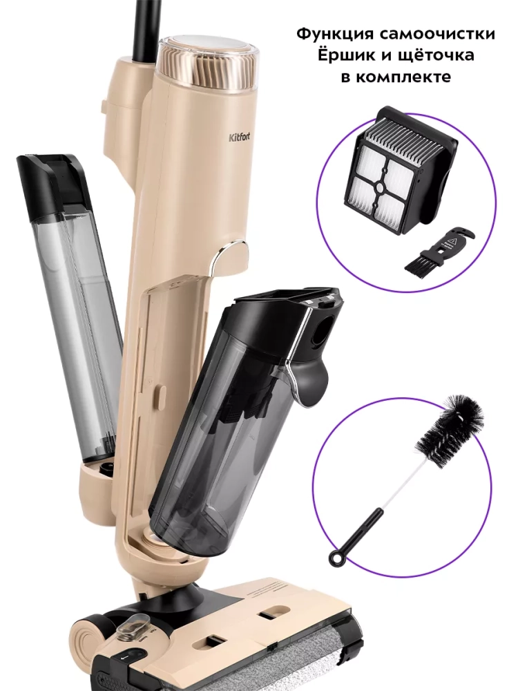 Беспроводной вертикальный моющий пылесос Kitfort КТ-5160 очень удобен при проведении влажной уборки. Благодаря работе от аккумулятора во время использования пылесос не нужно включать в сеть и провода не будут мешаться под ногами.