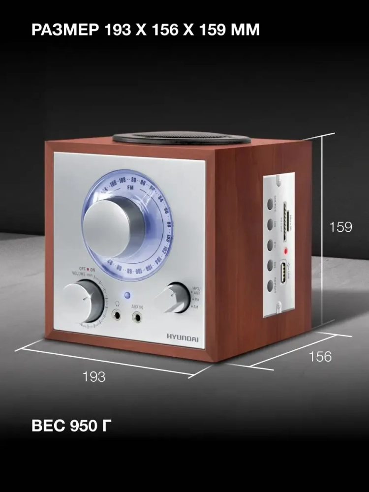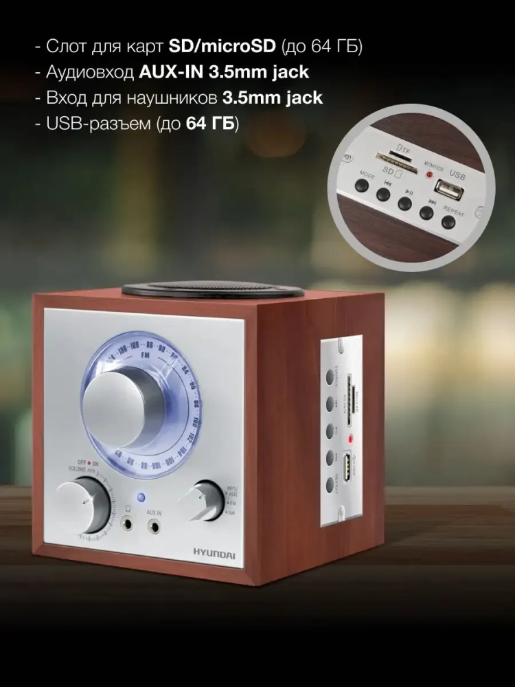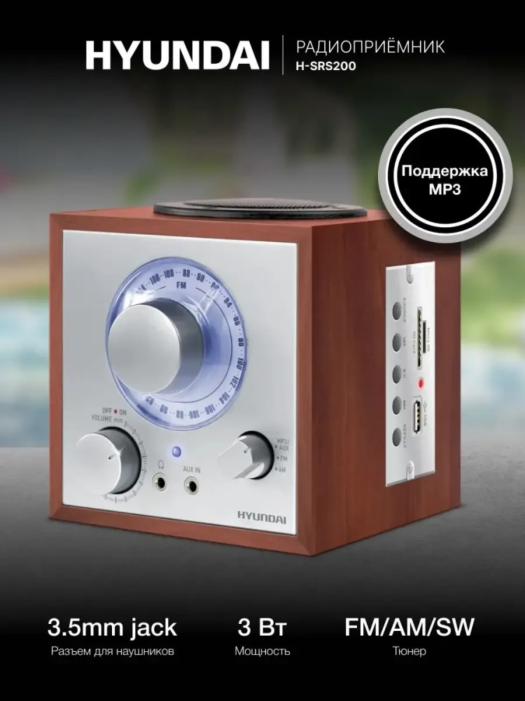 Радио Hyundai H-SRS200 - винтажное устройство с набором современных функций. Узнаваемый стиль прибору придает корпус четкой прямоугольной формы с заостренными углами. На передней части расположены графическая шкала в виде окружности и поворотный переключатель. Цвет корпуса соответствует заданному стилистическому направлению. Завершает образ динамик, расположенный на верхней плоскости. Он обеспечивает хорошее качество звука. В целом, такое устройство прекрасно поддержит соответствующее дизайнерское решение. Встроенная антенна отвечает за устойчивый прием сигналов радиостанций в двух диапазонах частот. Что касается интерфейса, то тут все вполне современно. Присутствует слот для карты памяти, а также можно подключить съемный накопитель USB. Функционирует прибор от аккумуляторной батареи или сети питания. Приятным бонусом будет возможность подключения наушников.