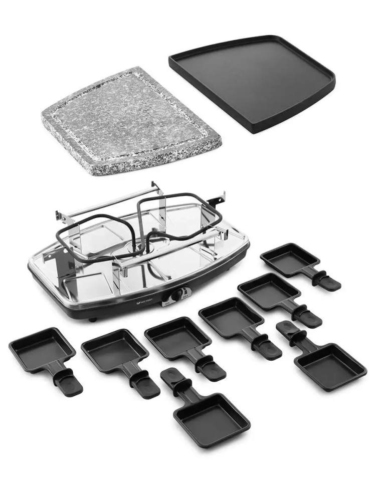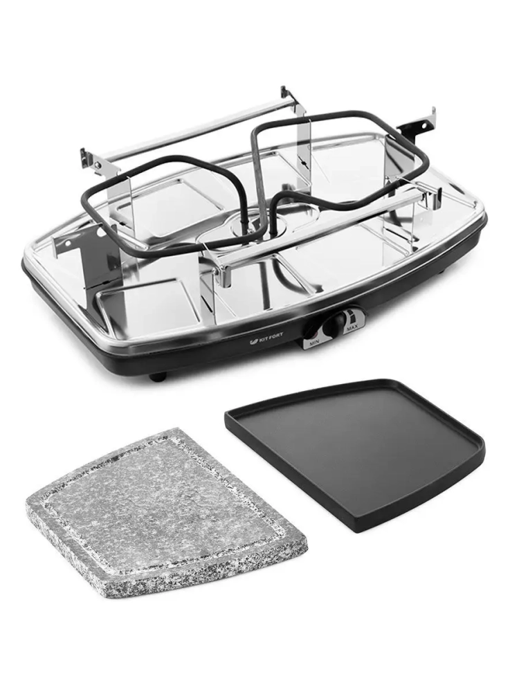 Современная раклетница Китфорт КТ-1649 имеет два яруса. На нижнем ярусе готовят сыр в порционных сковородках, верхний ярус представляет собой комбинированную жаровню, на которой можно приготовить мясо, креветки, колбаски-гриль, овощи и многое другое. На каменной плите лучше жарить мясо, а панель с антипригарным покрытием прекрасно подойдет для овощей и блинчиков.