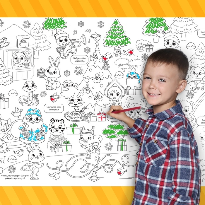 Раскраска-гигант «Змейка» — это настоящий простор для детской фантазии! Ведь внутри не просто картинки, а настоящий сюжет. Большой плакат могут раскрашивать несколько ребят одновременно, выполняя весёлые задания.