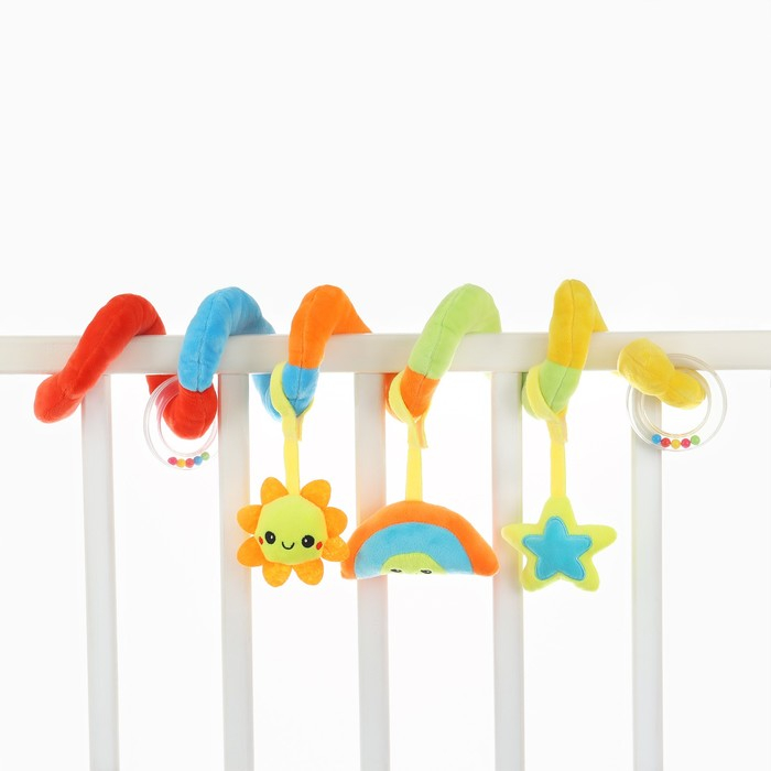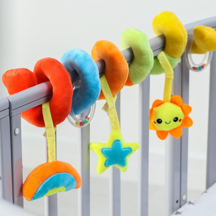 Мягкую и гибкую спиралевидную растяжку можно легко обмотать вокруг бортика кроватки, ручки автокресла, бампера коляски, разместить на шезлонг.
