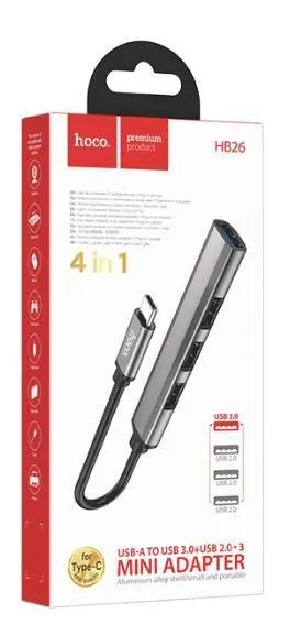 Ультратонкий металлический компактный USB-ХАБ / Разветвитель / Концентратор USB HUB 4 порта USB 3.0 HOCO HB26 серый, алюминий, 5 Гбит/с, 20 см, суперскоростной, качество.