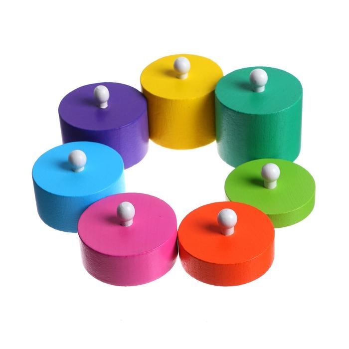 Развивающий набор состоит из семи цилиндров разных цветов и размеров.
