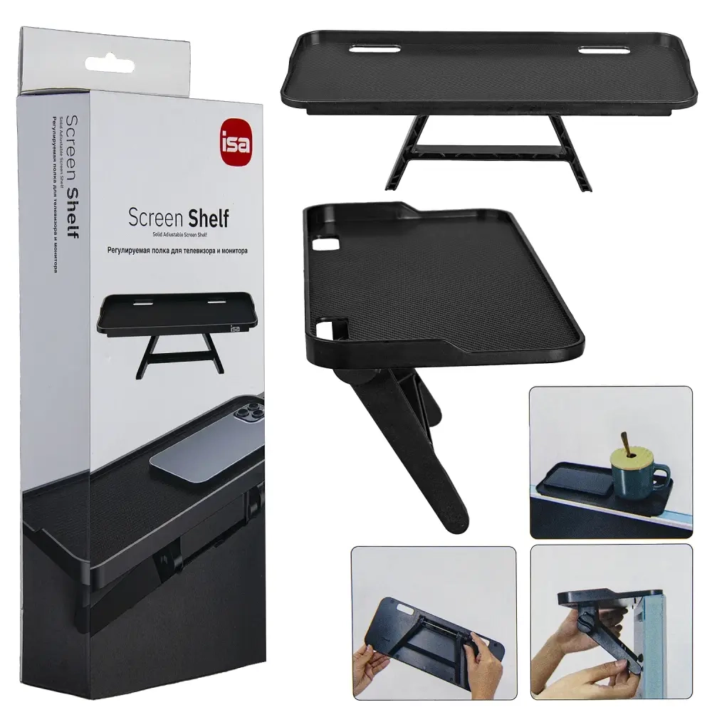 Многофункциональная, регулируемая полка для телевизора или монитора для удобного хранения пультов, wi-fi роутера, внешнего жёсткого диска, беспроводных колонок, игровых консолей, приставок и т.д. Опоры регулируются на 360 градусов, для установки никакие инструменты не требуются. При установке отрегулируйте угол наклона и зафиксируйте ручку. Материал - ABS пластик, металл. Максимальная нагрузка - до 2 кг. Вес товара