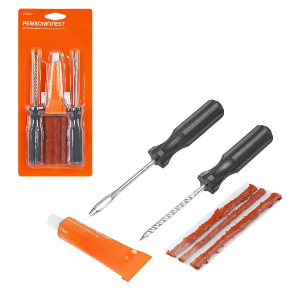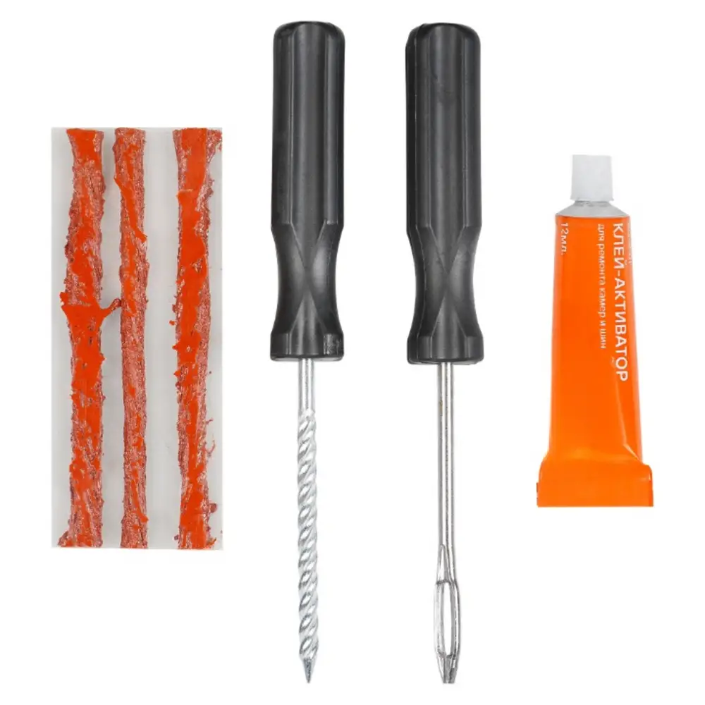 Ремонтный комплект поможет произвести экстренный ремонт шин. В наборе представлены инструменты шило со спиральным наконечником и шило для установик жгута с игольчатым наконечником, клей, а также 3 армированных жгута из сырой резины длиной 10 см. Набор является бюджетным вариантом оказания ремонтных услуг с базовым комплектом необходимых инструментов. С помощью инструмента c витым наконечником зачищается место прокола. С помощью инструмента с игольчатым отверстием прокол заделывается жгутом из сырой резины, на который предварительно наносится клей активатор. Пару минут ожидания и можно ехать!
