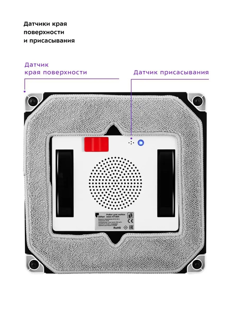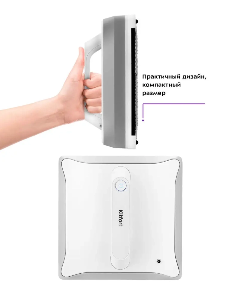 Робот Kitfort КТ-564 предназначен для мытья стекол, кафельных и зеркальных покрытий. Робот оснащен вентилятором, благодаря которому создается разрежение, и робот удерживается на гладкой вертикальной поверхности.