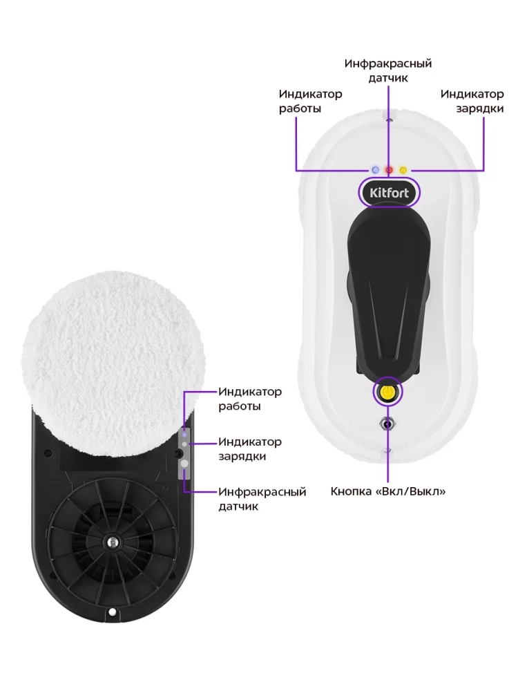 Робот Kitfort КТ-5182 предназначен для мытья стеклянных, кафельных и зеркальных поверхностей. Устройство оснащено вентилятором, который создает разрежение между дном робота и очищаемой поверхностью, благодаря чему робот удерживается на гладкой вертикальной поверхности. К двум держателям тряпок на дне робота крепятся чистящие тряпки, которые идут в комплекте. Тряпки оттирают и впитывают грязь. Прибор укомплектован страховочным тросом, поэтому вы можете использовать робот для высоких или широких окон. На случай внезапного отключения электричества робот снабжен резервной системой питания, которая будет удерживать робота на окне около 40 минут.