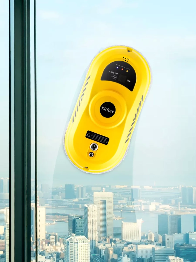 Робот Kitfort КТ-5186 предназначен для мытья стеклянных, кафельных и зеркальных поверхностей. Устройство оснащено вентилятором, который создает разрежение между дном робота и очищаемой поверхностью, благодаря чему робот удерживается на гладкой вертикальной поверхности. К двум держателям тряпок на дне робота крепятся чистящие тряпки, которые идут в комплекте. Тряпки оттирают и впитывают грязь. Прибор укомплектован страховочным тросом, поэтому вы можете использовать робот для высоких или широких окон. На случай внезапного отключения электричества робот снабжен резервной системой питания, которая будет удерживать робота на окне около 20 минут.
