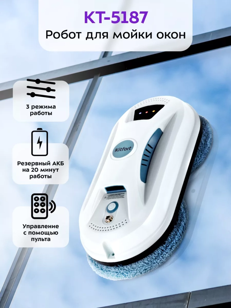 Робот Kitfort КТ-5187 предназначен для мытья стеклянных, кафельных и зеркальных поверхностей. Устройство оснащено вентилятором, который создает разрежение между дном робота и очищаемой поверхностью, благодаря чему робот удерживается на гладкой вертикальной поверхности. К двум держателям тряпок на дне робота крепятся чистящие тряпки. В комплекте 5 пар чистящих тряпок, поэтому вы можете их менять во время уборки. Тряпки оттирают и впитывают грязь. Прибор укомплектован страховочным тросом, поэтому вы можете использовать робот для высоких или широких окон. На случай внезапного отключения электричества робот снабжен резервной системой питания, которая будет удерживать робота на окне около 20 минут.