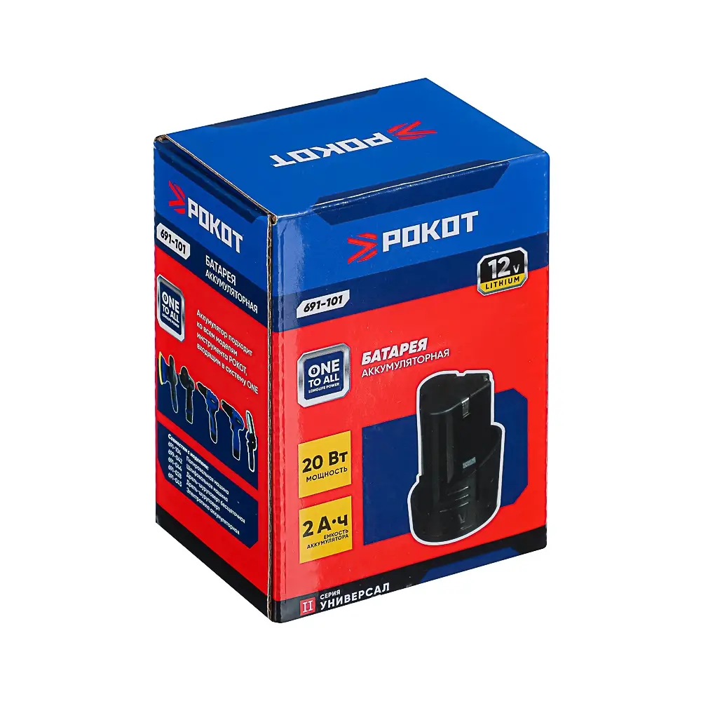 *ч мощностью 20 Вт, серия Универсал совместима со всеми моделями инструмента РОКОТ, входящими в систему ONE, в которую входят: шлифовальная машина, полировальная машина, бесщеточная дрель-шуруповерт, а также аккумуляторная электропила. Аккумулятор надежный, обеспечивает длительную и бесперебойную работу электроинструмента.