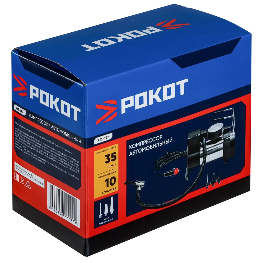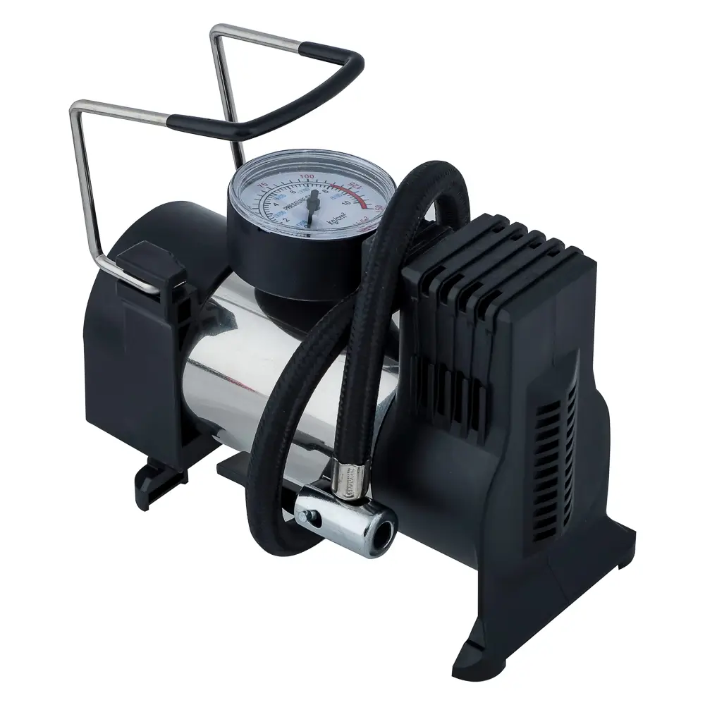 Автомобильный компрессор РОКОТ «Торнадо» с производительностью 35 л/мин и мощностью 90 Вт используется для подкачки шин в транспортных средствах. Работает от системы бортового питания с напряжением 12 В. Рабочее давление – 10 атм. Устройство имеет компактный размер, манометр для отслеживания и регулировки давления внутри камеры, а также обладает защитой от короткого замыкания. Быстро накачивает шины и безотказно работает в широком диапазоне температур – от -25 до +45 градусов Цельсия. Длина воздушного шланга – 2,7 м. Комплект также включает набор из 3-х переходников для разных типов воздушных клапанов.