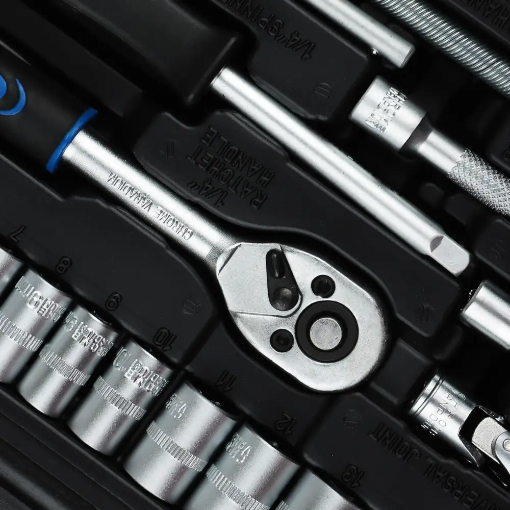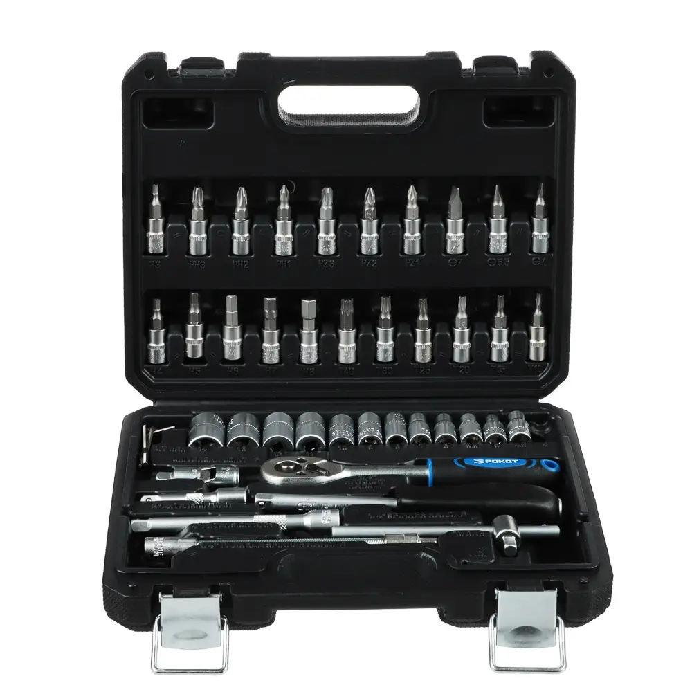 Набор автомобильных инструментов РОКОТ — надежный и практичный комплект, предназначенный для бытовых ремонтных работ и обслуживания автомобиля. Все входящие в комплект принадлежности изготовлены из высококачественной закаленной стали, поэтому надежны в применении. Эргономичные ручки обеспечивают удобный хват во время работы, а пластиковый кейс — компактное хранение 46 предметов и их комфортную транспортировку.
