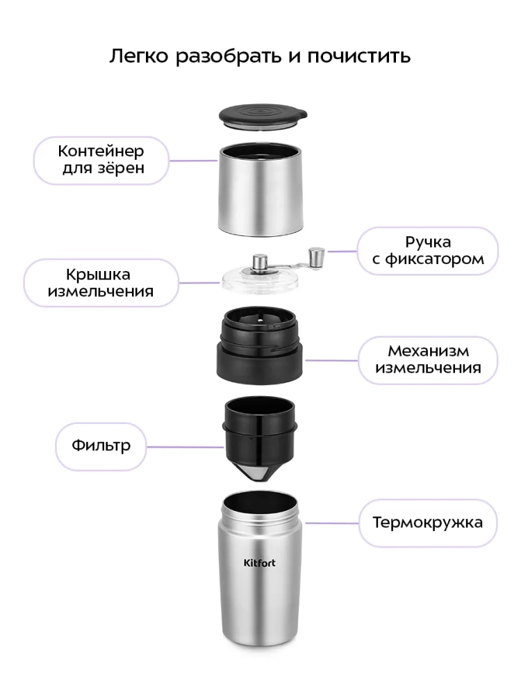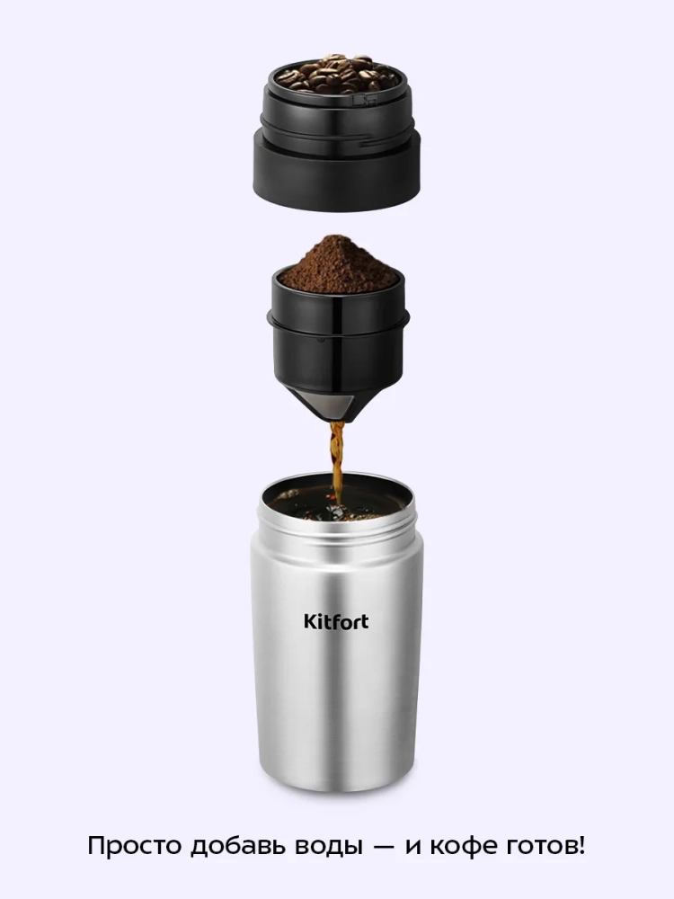 Ручная кофемолка «3 в 1» Kitfort KT-7533 совмещает в себе функцию не только кофемолки, но и капельной кофеварки, а также позволяет брать кофе с собой в термокружке. Кофемолка является ручной, она оснащена коническими жерновами из керамики. Прибор прост в использовании: измельченный кофе попадает в фильтр, после чего его заливают горячей водой, и кофе попадает в термокружку. Термокружку можно закрыть крышкой. В верхней части устройства есть контейнер для зерен, чтобы взять их с собой и заварить кофе из свежемолотых зерен.