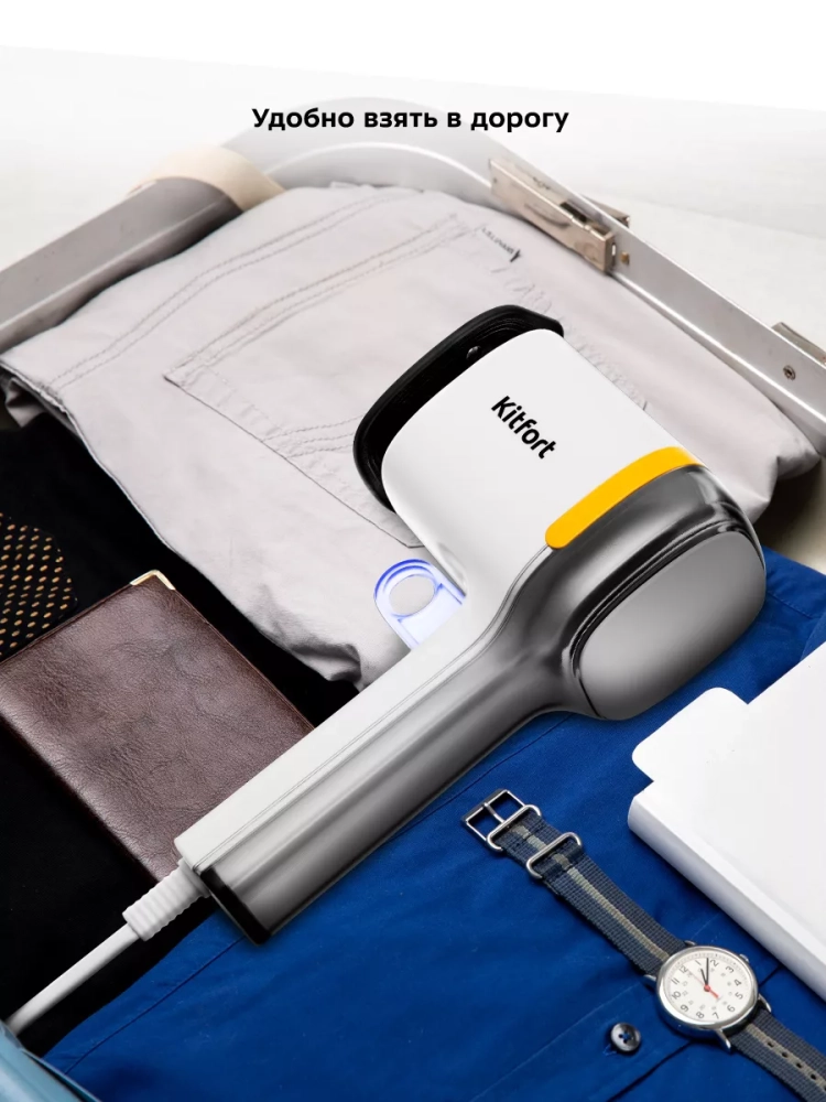 Устройство обладает такими достоинствами, как мощный поток пара, компактность и легкий вес. Его удобно брать с собой в дорогу — отпариватель не займет много места. Ручной отпариватель приведет в порядок вещи быстро и практически в любом месте — без раскладывания гладильной доски. Одежда при этом может висеть на вешалке, сушилке для белья или веревке.