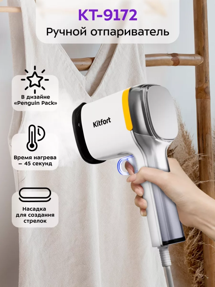 Ручной отпариватель Kitfort КТ-9172 предназначен для разглаживания изделий из текстиля с помощью потока горячего пара. Отпаривание — это тщательный уход за вещами, не отнимающий много времени.