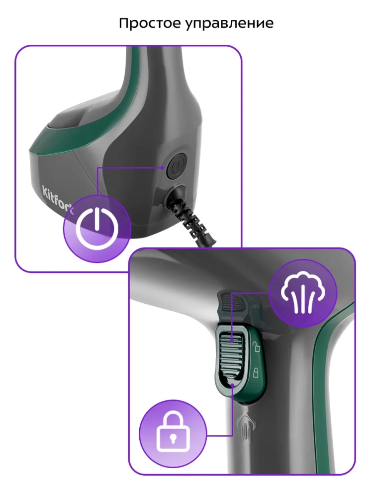 У отпаривателя КТ-9298 простое управление двумя кнопками на ручке прибора. Шнур отпаривателя оснащен защитой от перегиба, что увеличивает срок службы прибора. В комплекте предусмотрена ворсовая насадка, которая поможет очистить вещи от пыли, ворса, волос и шерсти домашних животных. Для удобства заполнения резервуара для воды в комплекте есть мерный стакан.