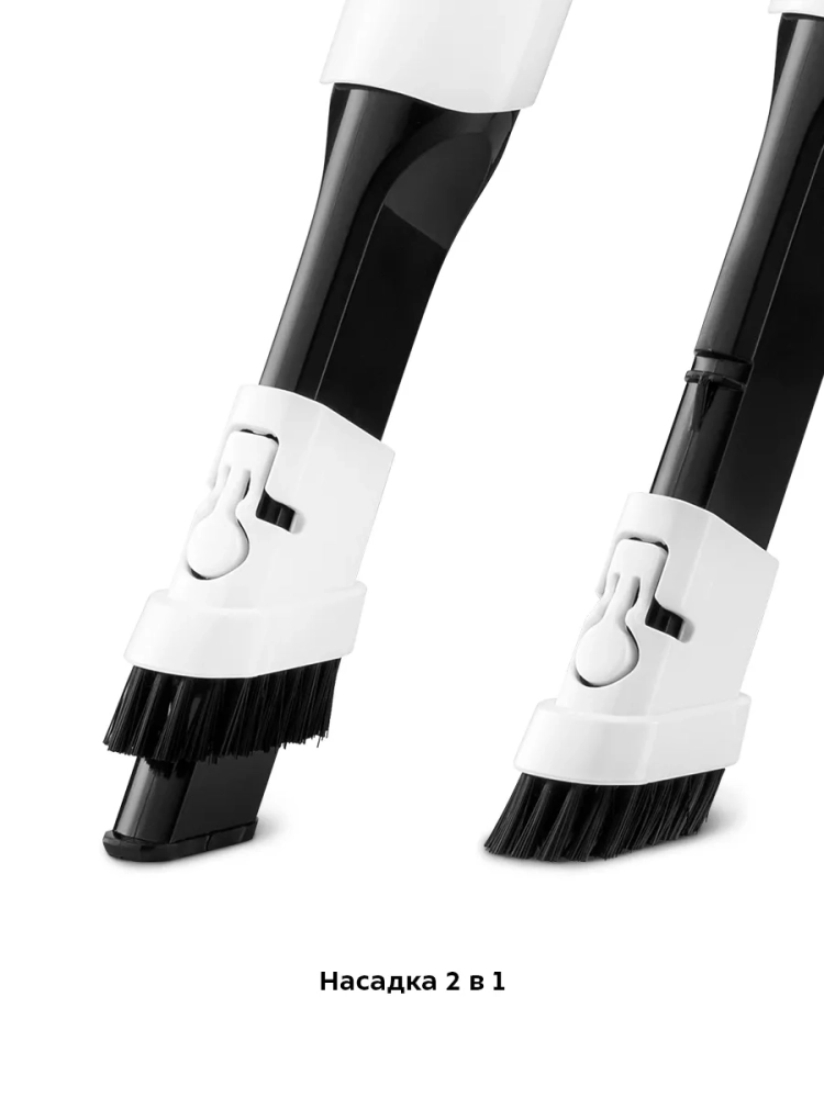 В комплекте к пылесосу идут насадка «2 в 1» и насадка для очистки мебели. Насадка «2 в 1» это узкая насадка с установленной на нее ворсовой щеткой. Ворсовая щетка подходит для чистки ковров и ковровых поверхностей, ковриков в салоне автомобиля, для сбора мелкого сыпучего мусора с неровных поверхностей. Если задвинуть ворсовую щетку, то насадка превращается в узкую насадку, которая удобна для уборки труднодоступных мест. Для очистки обивки мебели и других тканевых покрытий предусмотрена насадка для очистки мебели.