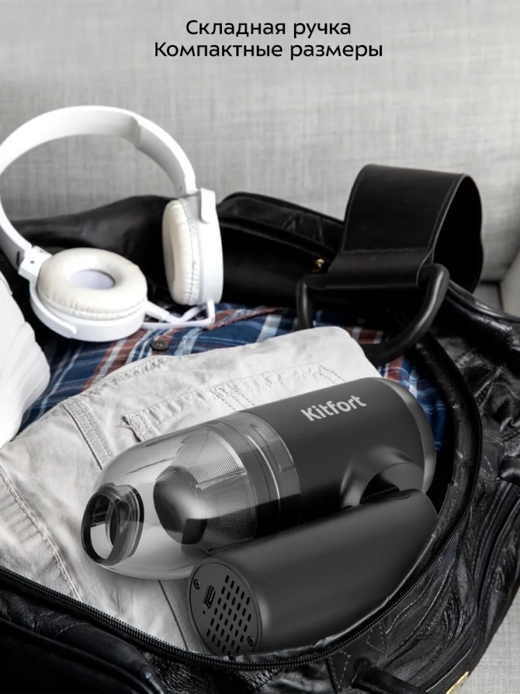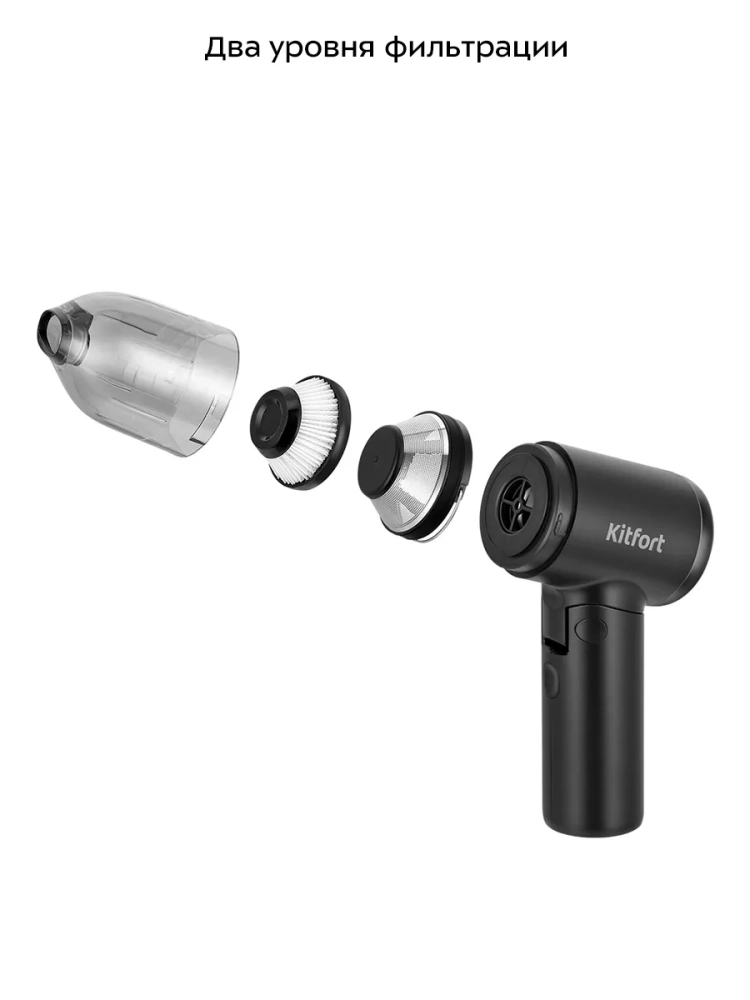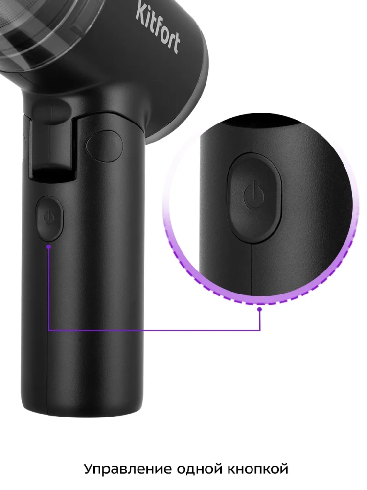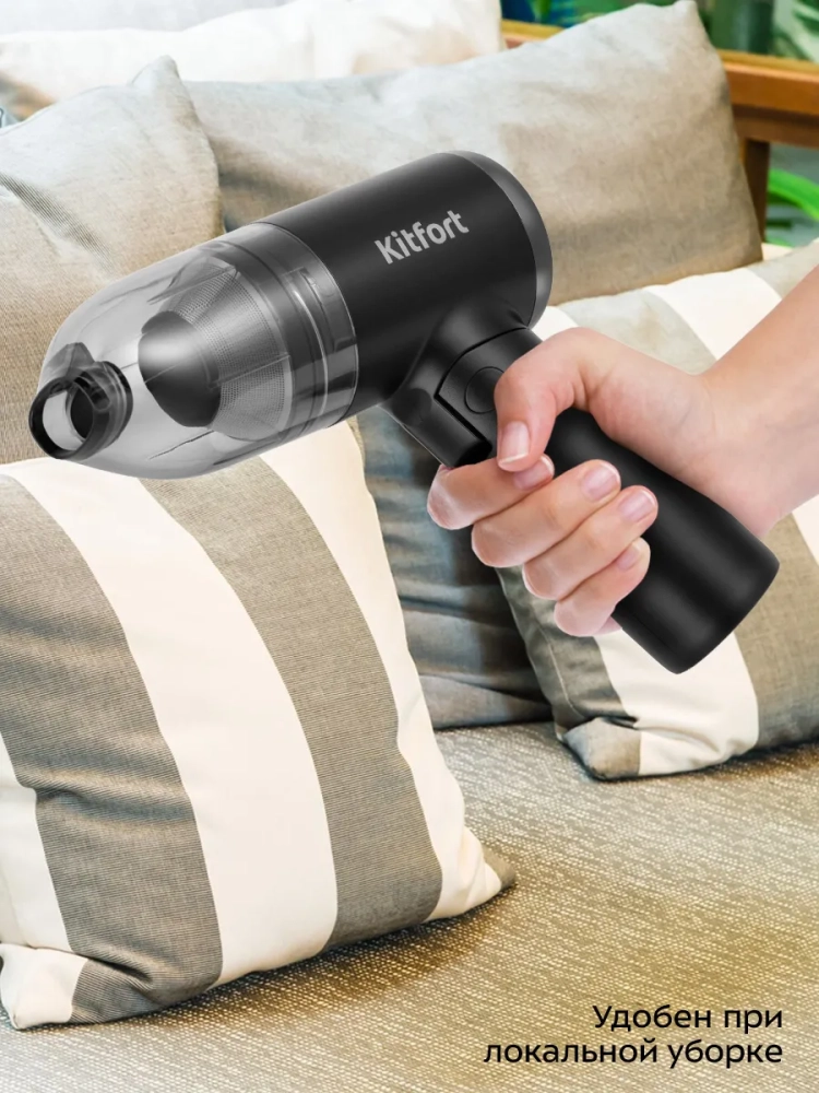 Ручной пылесос Kitfort КТ-5215 удобен при локальной уборке. Он компактен и работает от аккумулятора, поэтому его легко брать с собой для уборки в автомобиле или на даче.