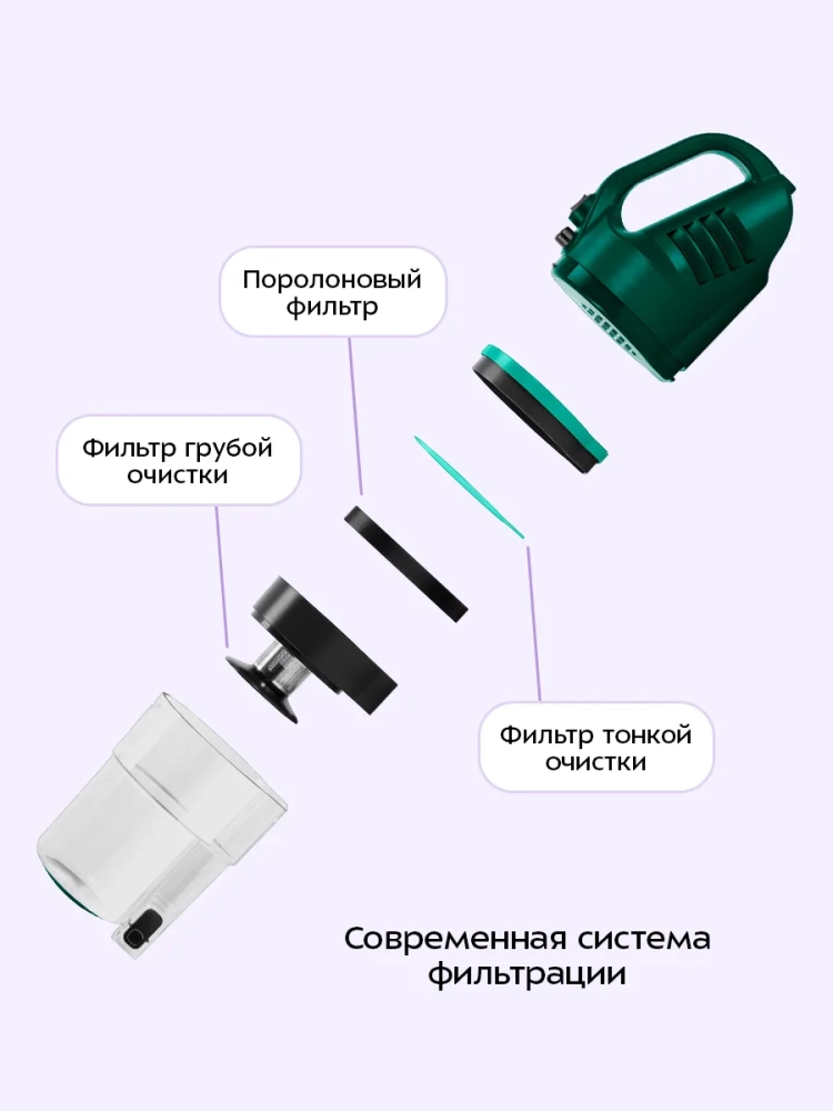 Ручной пылесос оборудован двухуровневой системой фильтрации. Фильтр грубой очистки отсеивает наиболее тяжелые или объемные загрязнения, попавшие в пылесборник. Благодаря ему тяжелый мусор не попадает в поролоновый фильтр и фильтр тонкой очистки. Поролоновый фильтр и фильтр тонкой очистки задерживают мельчайшие частички пыли, чтобы защитить мотор устройства. Запасные фильтры тонкой очистки (30 шт.) входят в комплект.