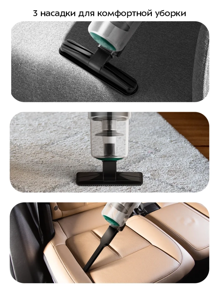 Пылесос оборудован плоской и щелевой насадками, а также ворсовой щеткой. Плоская насадка поможет очистить обивку мебели и другие тканевые покрытия. Щелевая насадка удобна для уборки таких труднодоступных мест, как радиаторы отопления, углубления в мягкой мебели, углы и щели. Ворсовая щетка устанавливается для чистки ковровых поверхностей, ковриков в салоне автомобиля и сбора мелкого сыпучего мусора с неровных поверхностей. Ворс щетки способствует лучшей очистке и не царапает поверхность. Кроме того, вы можете использовать ручной пылесос без насадок (для уборки сухого мусора с гладких поверхностей).