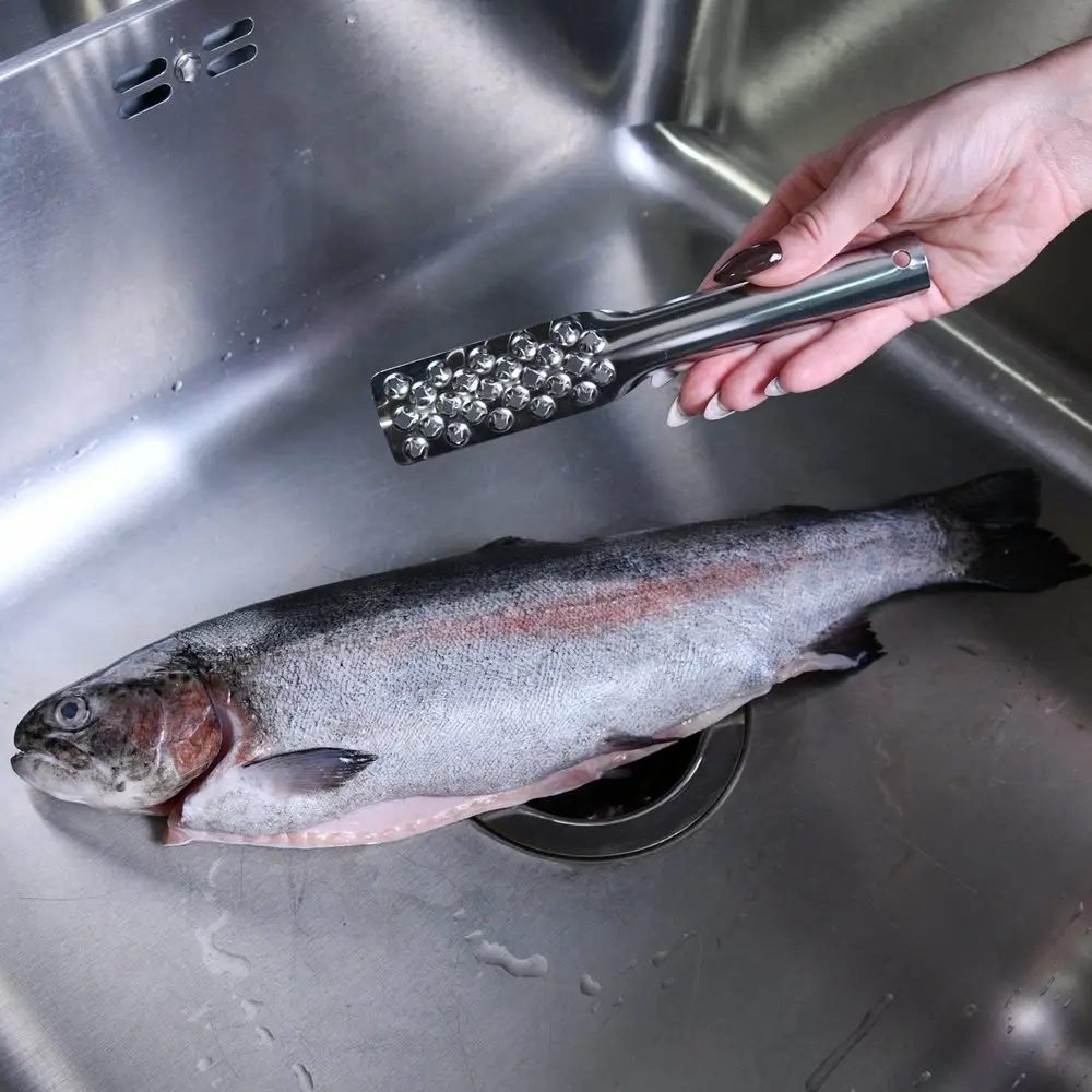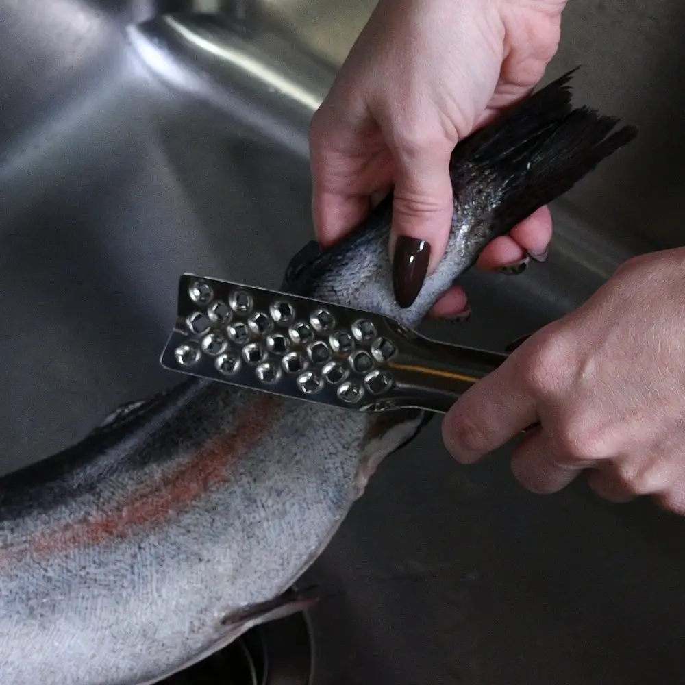 Чистка от чешуи очень часто вызывает дискомфорт. Как почистить быстро и без особых хлопот? Удобный предмет для очистки рыбы в домашних условиях – ручная рыбочистка. С этим приспособлением вы быстро удалите чешую, сохраните порядок на кухне и приступите к приготовлению рыбных блюд. Помойте тушку, выложите ее в удобную миску, возьмите рыбочистку и начинайте чистить против роста чешуи. Лучше всего делать это прямо в раковине. После очистки одной стороны сделайте то же самое с другой. Изделие полностью состоит из коррозионностойкой (нержавеющей) стали, легко моется и не впитывает запахи. Простой дизайн и универсальная конструкция делают изделие подходящим для любого вида рыбы.