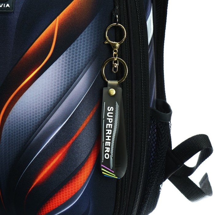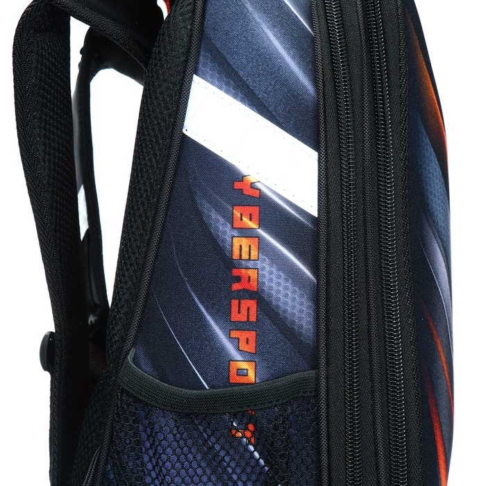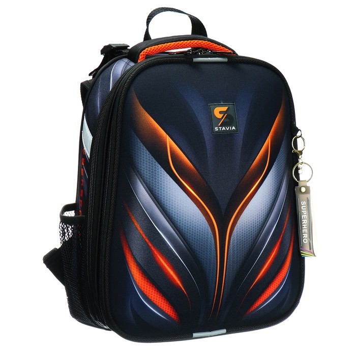 Ранец из формованного EVA-материала и высокопрочного непромокаемого полиэстера. Два вместительных отделения на реверсивной пластиковой молнии; в первом — «плавающие» перегородки для тетрадей и учебников, во втором – большой карман из сетки и карманы-органайзеры. Спинка с анатомическими элементами дополнительно укреплена пластиком, сверху – дышащая трехслойная сетка. Лямки-маечка плотные, мягкие. Регулируются по длине и высоте. Ранец снабжен нагрудным фиксатором и двумя боковыми карманами из прочной сетки. Есть мягкая ручка для переноски и дополнительная петлевая ручка для размещения ранца на крюке. На дне две пластиковые ножки. Ранец имеет светоотражающие элементы на лямках и корпусе. Брелок в комплекте.