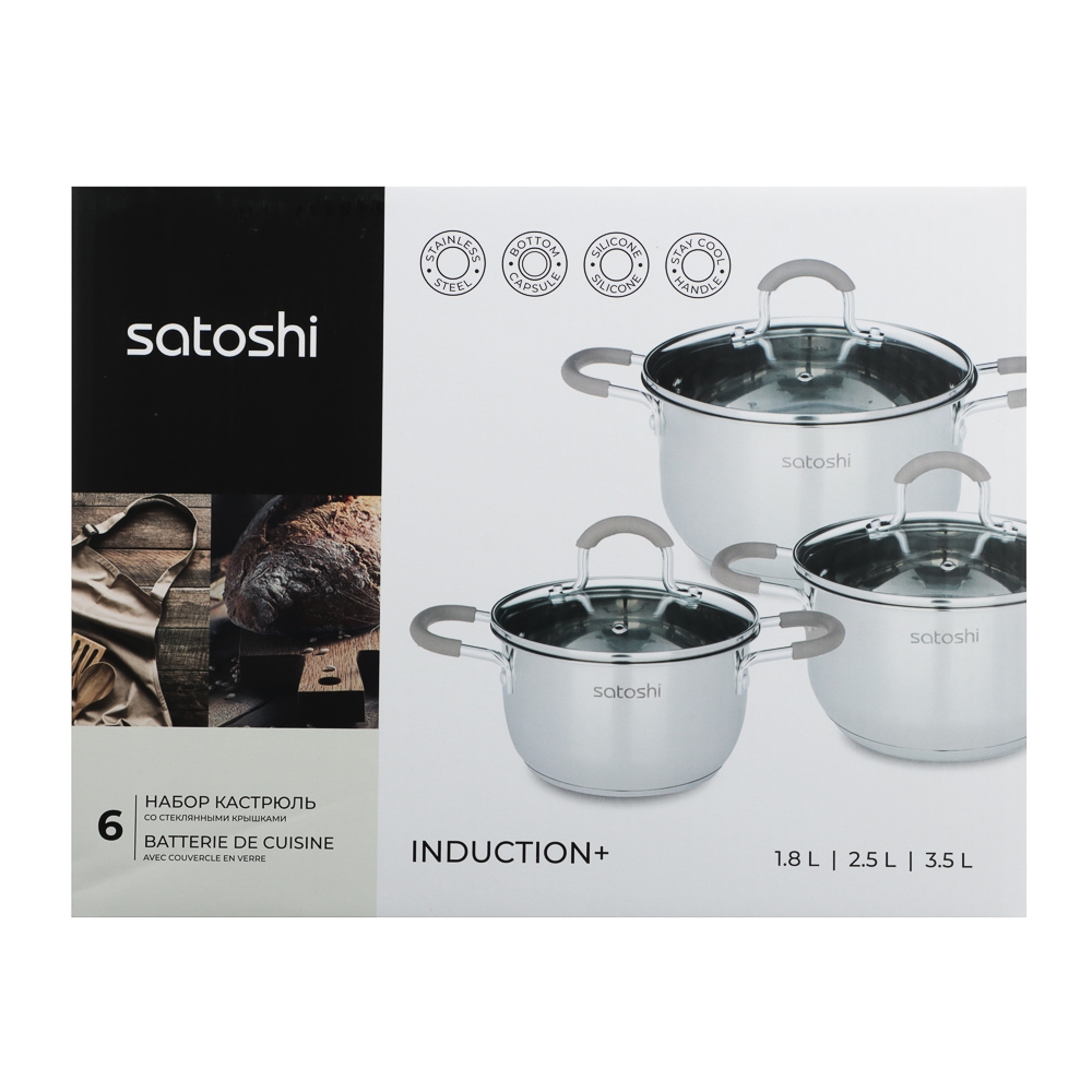 SATOSHI Альбер Набор кастрюль 6 пр.: 1,8л, 2,5л, 3,5л, бежевые силиконовые ручки, со стекл. крышкой