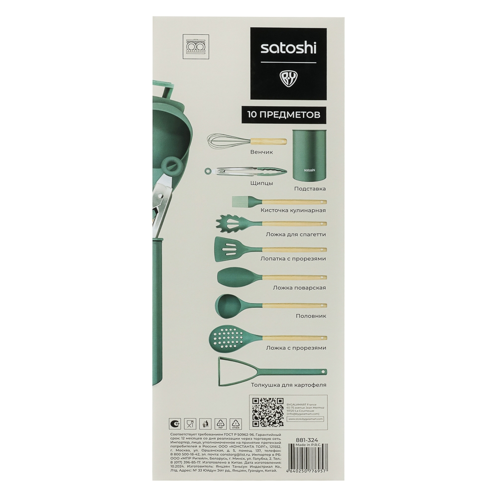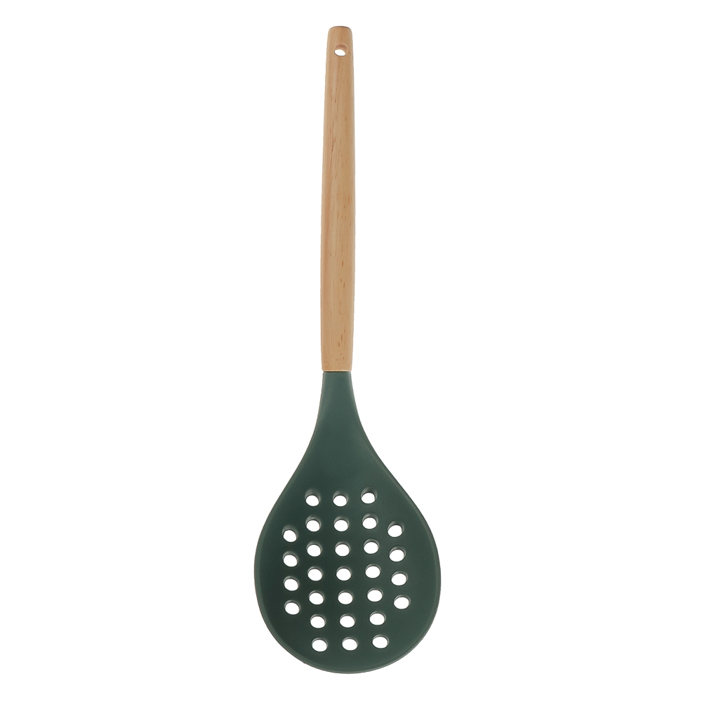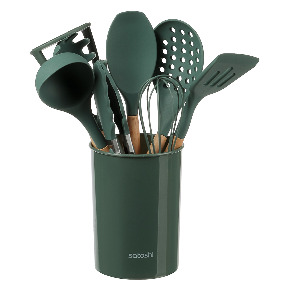 Набор кухонных принадлежностей SATOSHI Эрно — практичный и стильный комплект для кухни, выполненный в зеленом цвете с деревянными ручками. Набор включает 10 предметов из термостойкого силикона, безопасного для посуды с антипригарным покрытием: толкушку для картофеля, поварскую ложку, щипцы, ложку для спагетти, половник, лопатку с прорезями, кулинарную кисточку, подставку, венчик и ложку с прорезями. Деревянные ручки обеспечивают удобство использования, добавляя приятные тактильные ощущения и надежный хват. Они легкие, экологичные и придают инструментам дополнительную прочность, делая процесс готовки более комфортным.