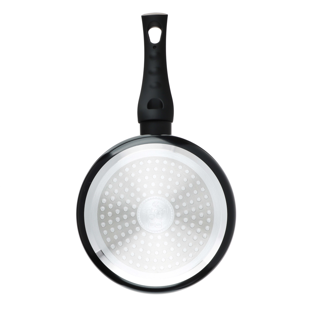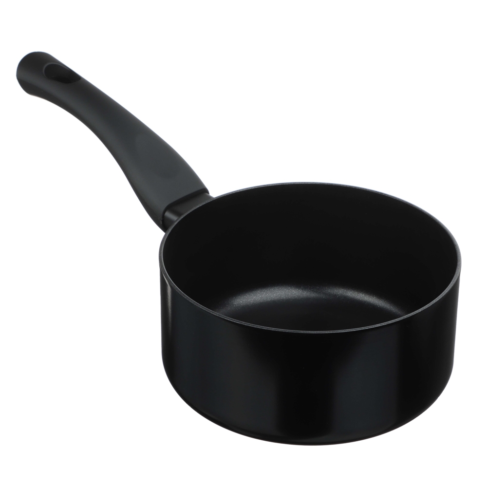 Ковш SATOSHI Графит диаметром 16 см и высотой 8 см — идеальный выбор для ежедневного приготовления. Антипригарное покрытие гарантирует легкость готовки и чистки, а универсальный черный цвет придает посуде современный вид. Подходит для всех типов плит, включая индукционные, что делает его практичным для любой кухни. Удобная петля для подвешивания обеспечивает компактное хранение.