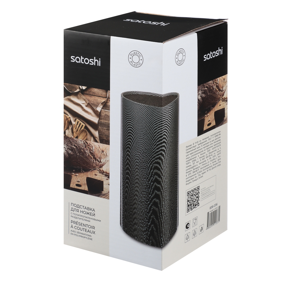 Универсальная подставка для ножей SATOSHI Алмаз, выполненная из пищевого пластика с наполнителем из полипропилена, максимально бережно сохранит ножи. Наполнитель легко моется и сушится, а благодаря высокому качеству сырья он прослужит долгое время.