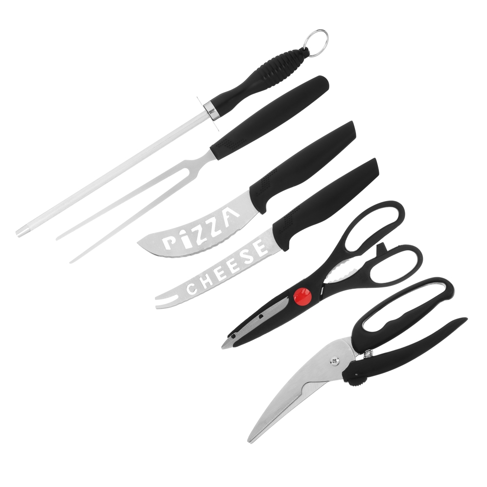 Набор ножей кухонных на подставке Доляна, 6 предметов: ножи 8 см, 11 см, 13 см, 19 см, 20 см, ножницы, цвет чёрный