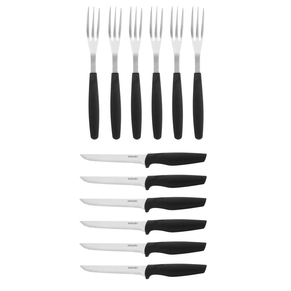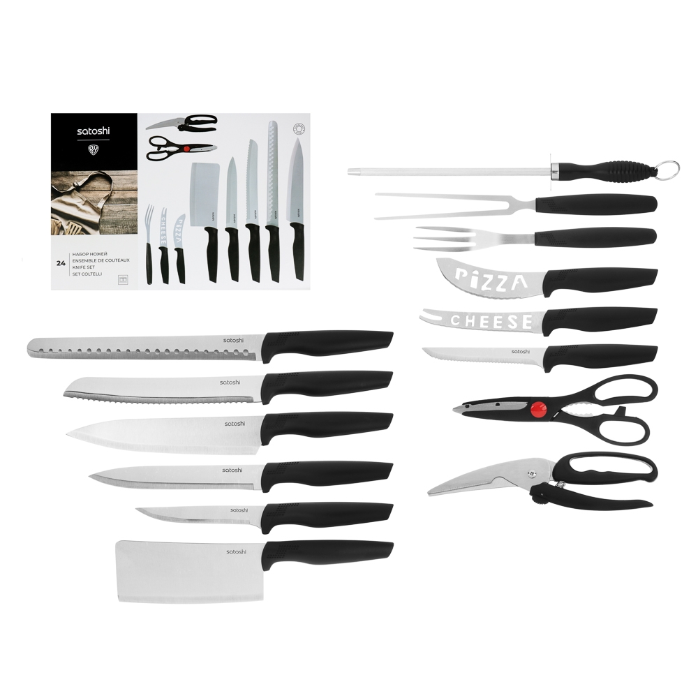 Эксклюзивный набор SATOSHI Малон — воплощение совершенства для вашей кухни, объединяющий 24 высококачественных инструмента, удобно размещенных в стильной коробке. Каждый нож выполнен из нержавеющей стали, обеспечивая идеальный баланс, остроту и долговечность. В набор входят: нож для сыра (12,7 см), нож для пиццы (11,4 см), нож для ветчины (23 см), шеф-нож (20 см), универсальный нож (20 см), нож для хлеба (20 см), кухонный топор (17,8 см), обвалочный нож (12,7 см), мусат для заточки, шесть вилок для мяса, шесть ножей для мяса (11,4 см), двое кухонных ножниц. Набор создан для истинных ценителей кулинарного искусства. Подчеркните стиль и изысканность своей кухни с SATOSHI Малон — идеальным союзником как для повседневных блюд, так и для гурманов.