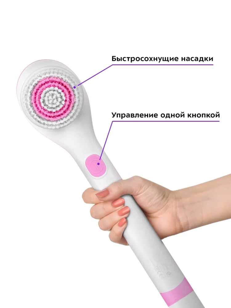 Рабочие поверхности насадок не травмируют кожу, быстро сохнут и легко очищаются. Благодаря эргономичной форме корпуса прибор удобно держать в руках.