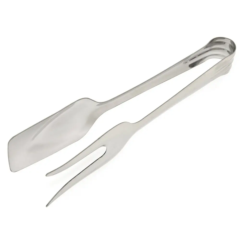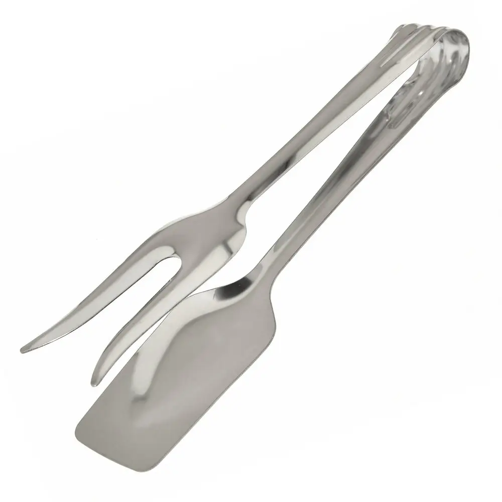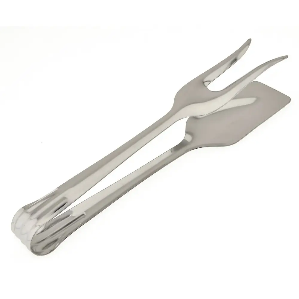 Дополнительно к набору традиционных аксессуаров для кухни используйте универсальные щипцы. Изделие многофункционально и практично в использовании. Одна сторона выполнена в виде лопатки, другая – в виде двузубой вилки для нанизывания продуктов. Перемешивайте салаты, переворачивайте шпикачки, мясо, рыбу и овощи во время жарки на сковороде или гриле. Приспособление пригодится для порционного раскладывания блюд. Щипцы изготовлены из стали с хромированным покрытием, выглядят стильно, рассчитаны на длительное использование. Можно мыть в посудомоечной машине.