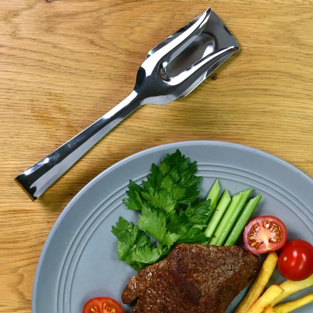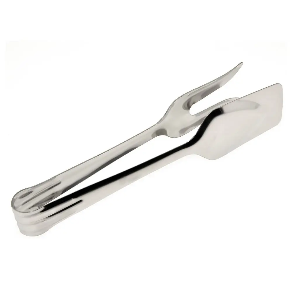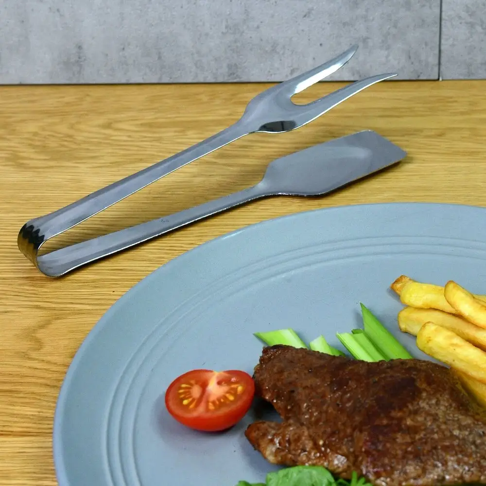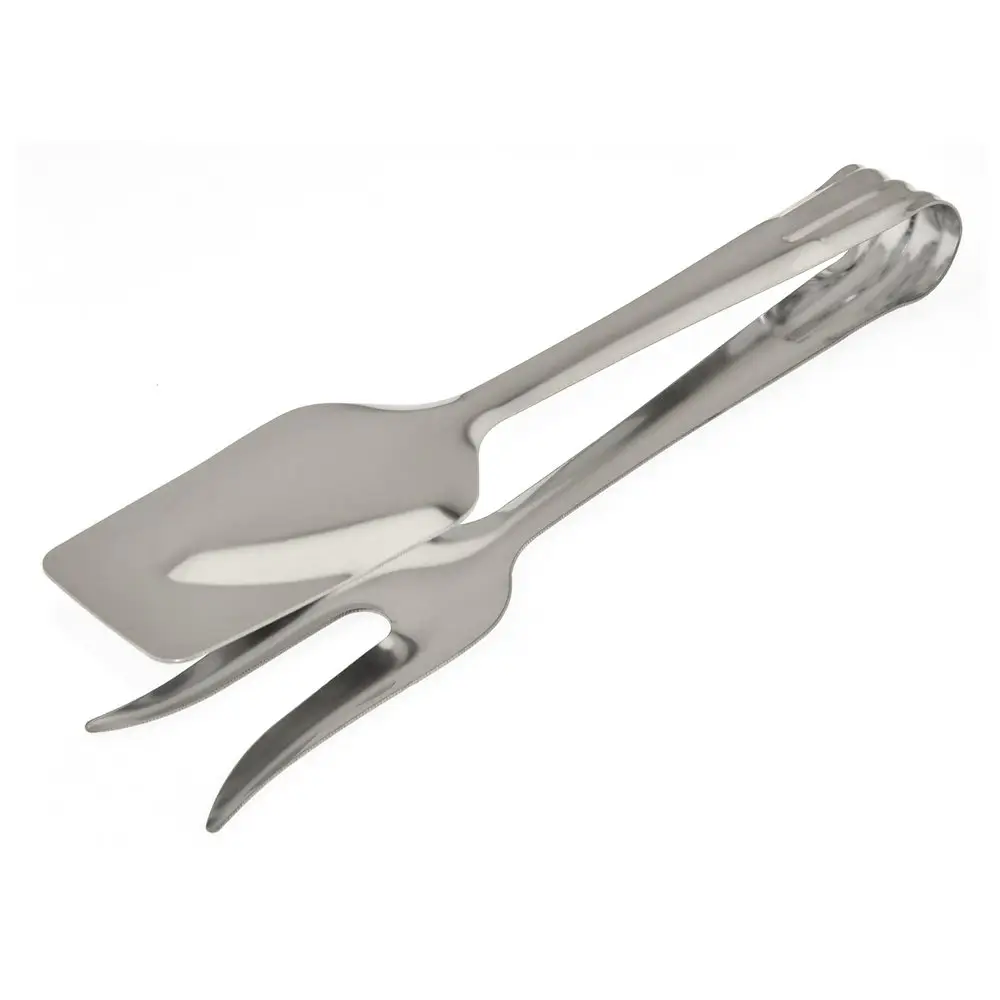 Дополнительно к набору традиционных аксессуаров для кухни используйте универсальные щипцы. Изделие многофункционально и практично в использовании. Одна сторона выполнена в виде лопатки, другая – в виде двузубой вилки для нанизывания продуктов. Перемешивайте салаты, переворачивайте шпикачки, мясо, рыбу и овощи во время жарки на сковороде или гриле. Приспособление пригодится для порционного раскладывания блюд. Щипцы изготовлены из стали с хромированным покрытием, выглядят стильно, рассчитаны на длительное использование. Можно мыть в посудомоечной машине.