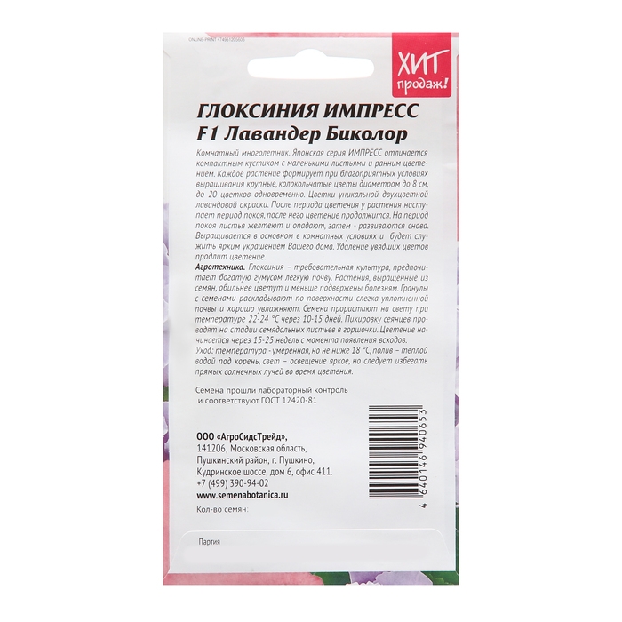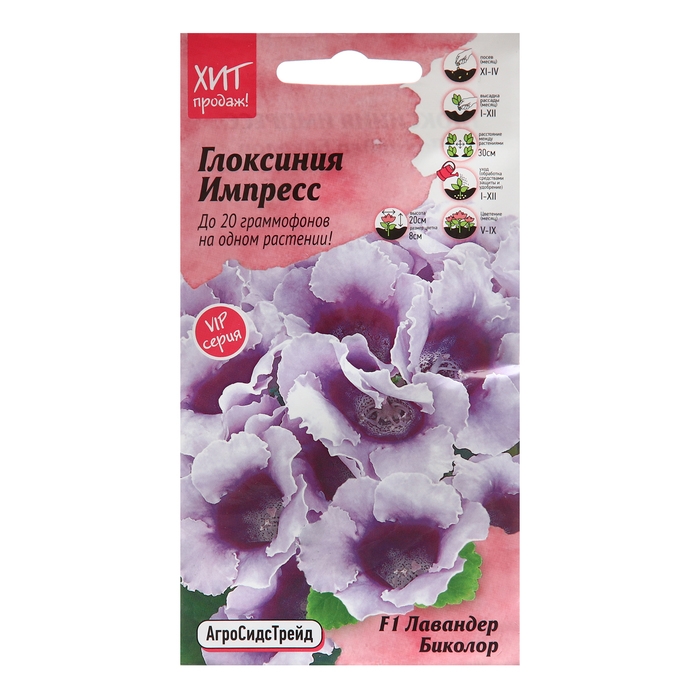 Комнатный многолетник. Японская серия ИМПРЕСС отличается компактным кустиком с маленькими листьями и ранним цветением. Каждое растение формирует при благоприятных условиях выращивания крупные, колокольчатые цветы в диаметре до 8 см, до 20 цветков одновременно. Цветки уникальной двухцветной лавандовой окраски. После периода цветения у растения наступает период покоя, после него цветение продолжится. На период покоя листья желтеют и опадают, затем - развиваются снова. Выращивается в основном в комнатных условиях и будет служить ярким украшением Вашего дома. Удаление увядших цветов продлит цветение. Агротехника: Глоксиния – требовательная культура, предпочитает богатую гумусом легкую почву. Растения, выращенные из семян, обильнее цветут и меньше подвержены болезням. Гранулы с семена раскладывают по поверхности слегка уплотненной почвы и хорошо увлажняют. Семена прорастают на свету при температуре 22-24°С через 10-15 дней. Пикировку сеянцев проводят на стадии семядольных листьев в горшочки. Цветение начинается через 15-25 недель с момента появления всходов. Уход: температура - умеренная, но не ниже 18°С, полив – теплой водой под корень, свет – освещение яркое, но следует избегать прямых солнечных лучей во время цветения. Штрих-код -