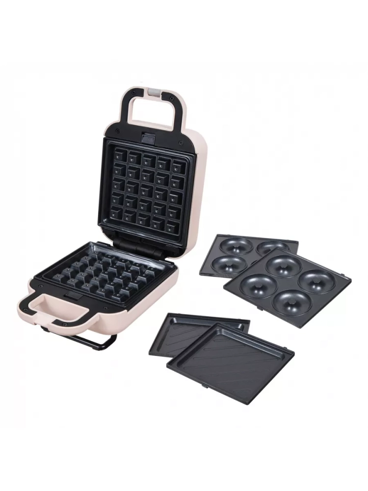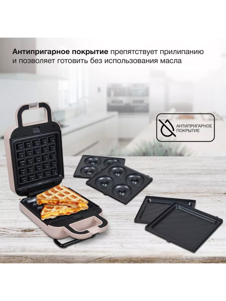 Сэндвичница Hyundai HYSM-1303 бежевый, мощность 600Вт, формы для готовки: пластины для вафель, гриля, пончиков. Съемные формы. Антипригарное покрытие нагревательных частей. Замок фиксации закрытия крышки.