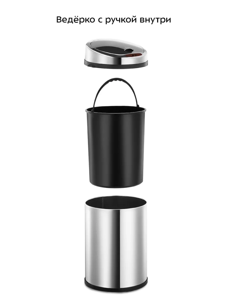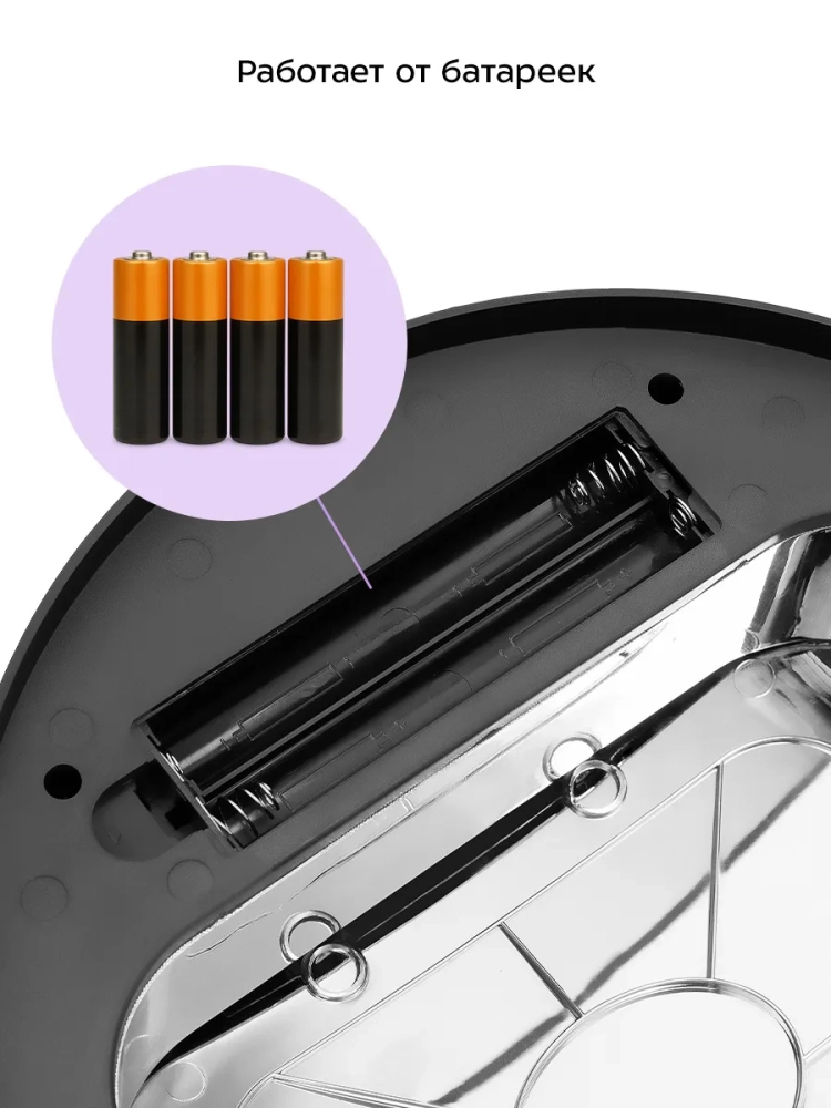Внутри мусорного ведра находится внутреннее пластиковое ведро с ручкой, которое легко очистить от мусора и помыть при необходимости. Устройство работает от 4 батареек типа АА, которых хватает на долгое время. Батарейки в комплект не входят.