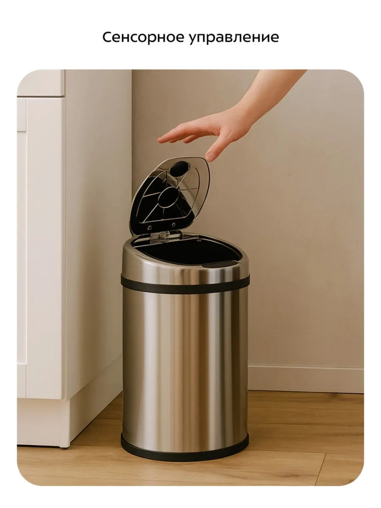 Сенсорное мусорное ведро оснащено инфракрасными датчиками. Такое ведро открывается и закрывается автоматически, и его не нужно касаться при выбрасывании мусора. Датчики ведра КТ-6029 расположены на крышке сверху. Когда объект появляется в зоне действия датчиков, откидная крышка ведра автоматически открывается и закрывается через 6 секунд. На крышке также есть небольшая ручка, чтобы открывать ее без использования сенсора. При желании можно отключить датчики и пользоваться устройством как обычным мусорным ведром.