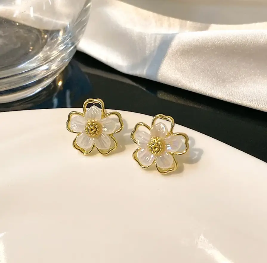 Серьги-гвоздики Цветы белые золотистые