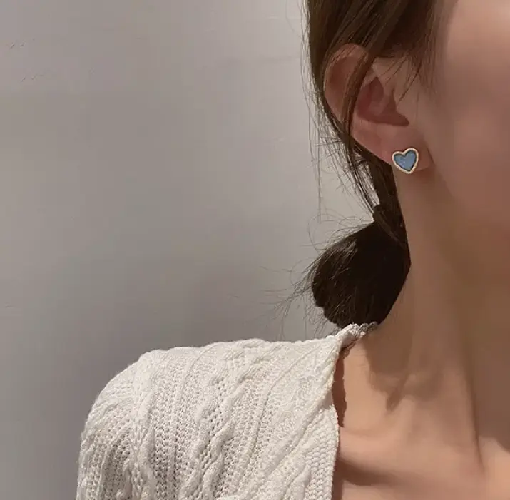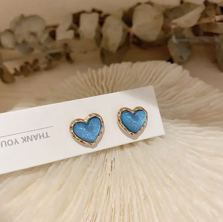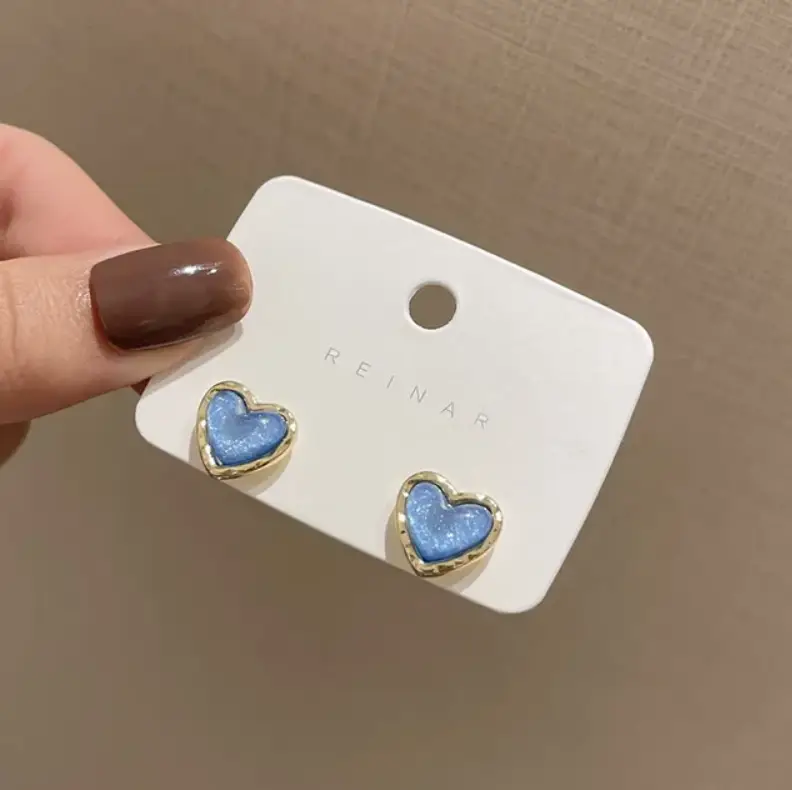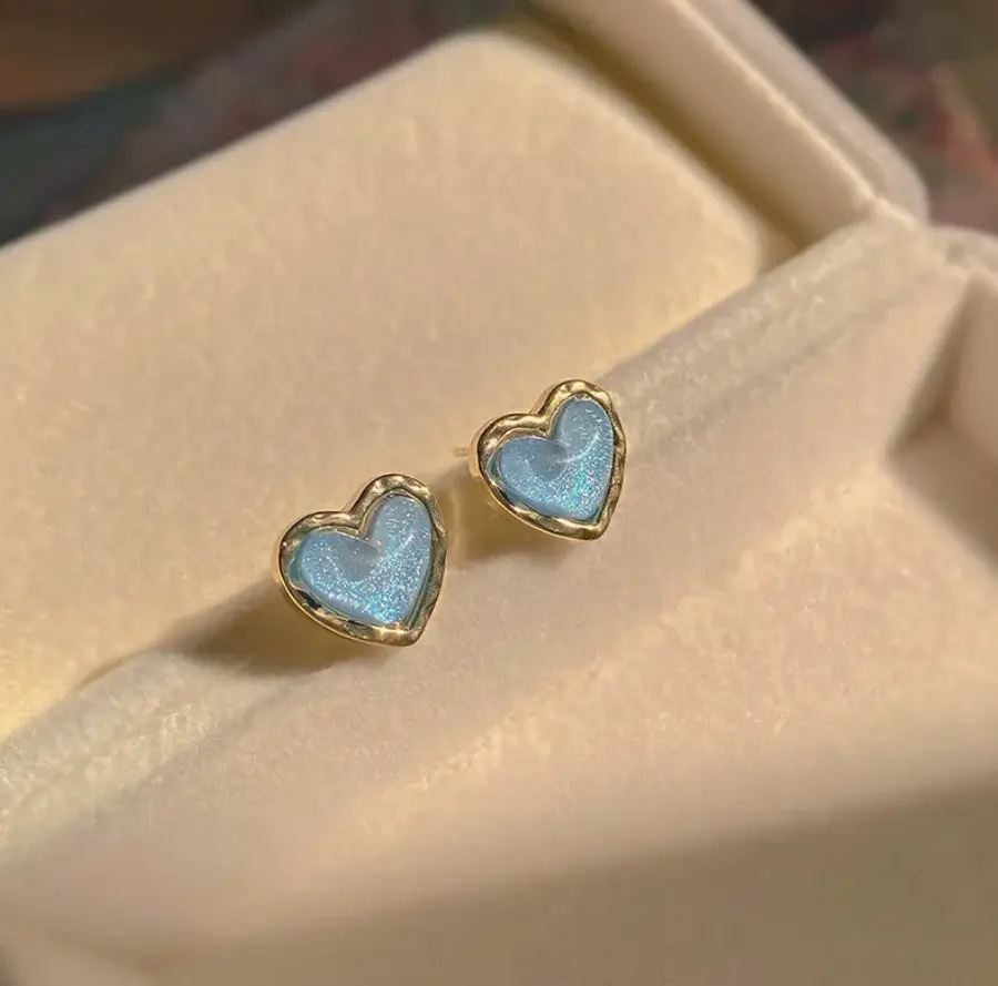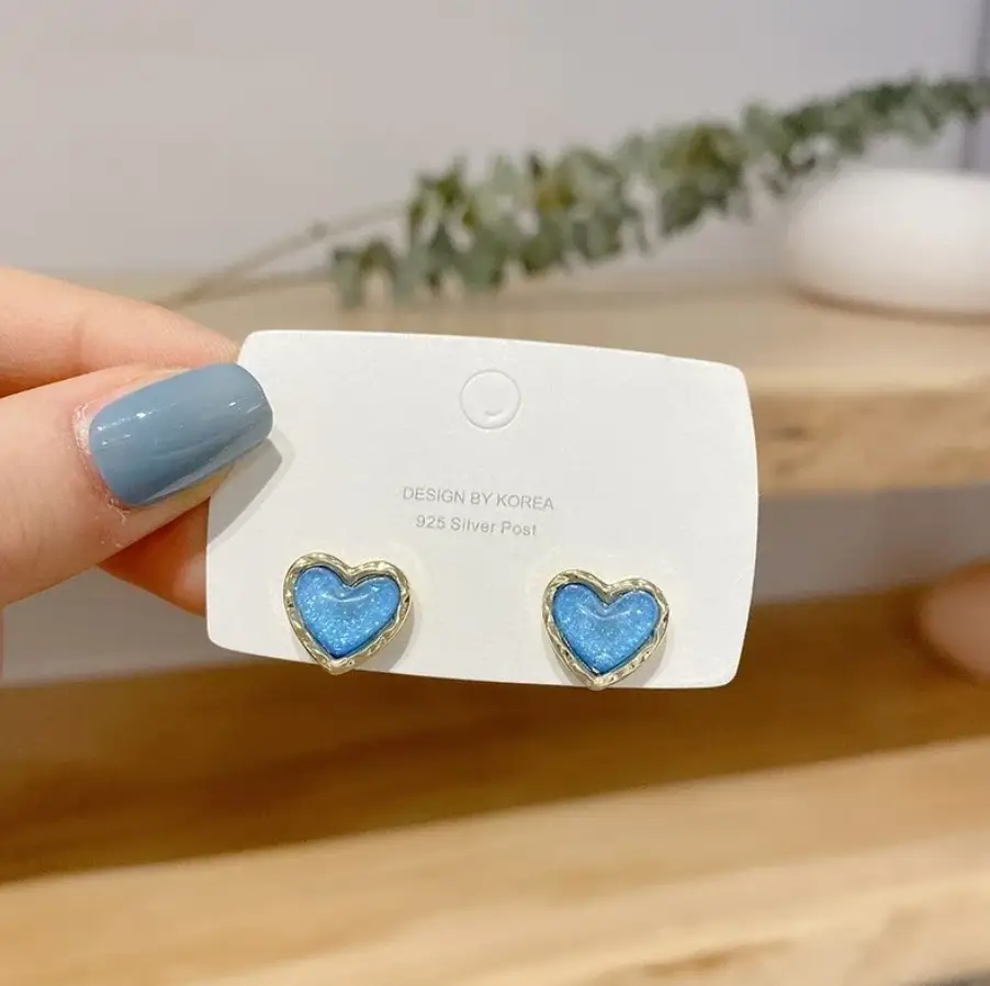 Серьги гвоздики Голубые сердечки серебристые