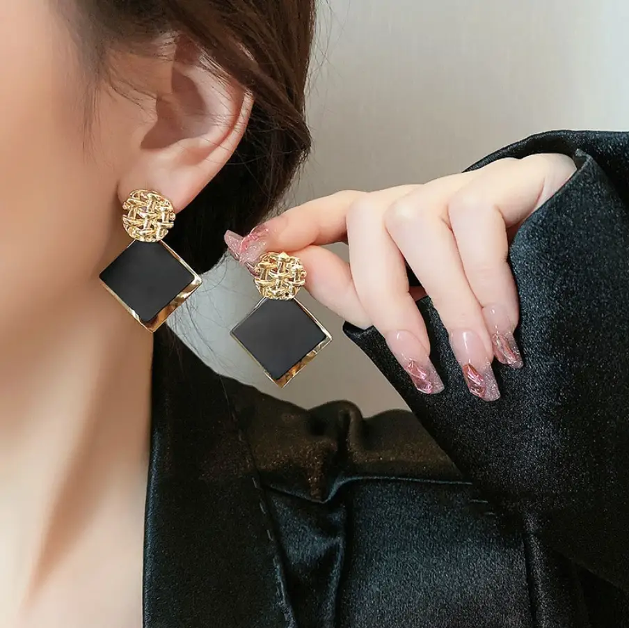 Серьги-пусеты черные ромбы с золотом