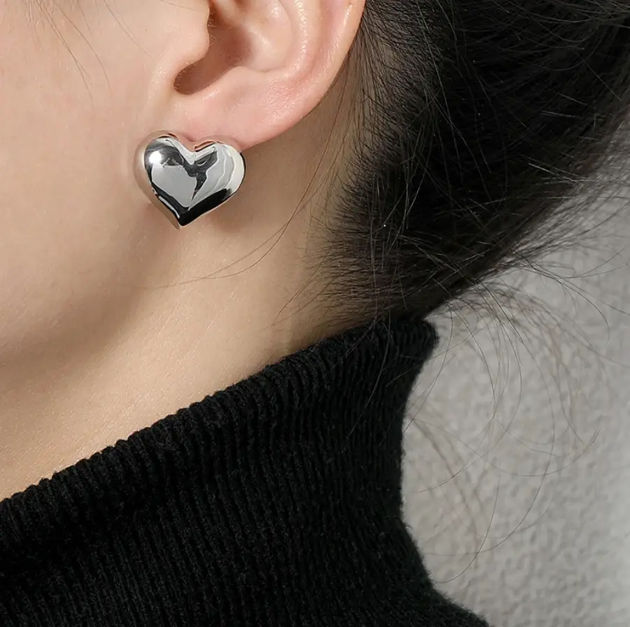 Серьги пусеты Сердца объемные серебристые