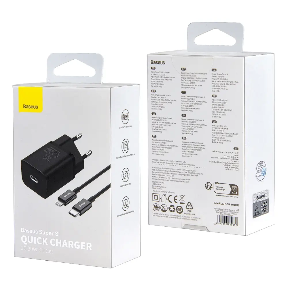 Сетевое зарядное устройство с кабелем Type-C-Lightning PD20W TZCCSUP-B01 Baseus черное