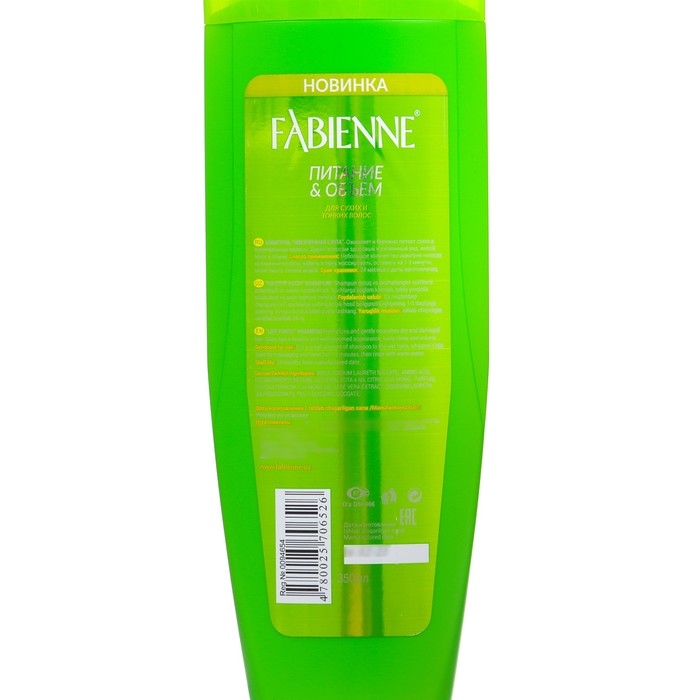 Шампунь FABIENNE "Питание и объем" - это уникальное средство, разработанное для комплексного ухода за волосами. Объем флакона составляет 350 мл, обеспечивая достаточное количество продукта для длительного использования.
