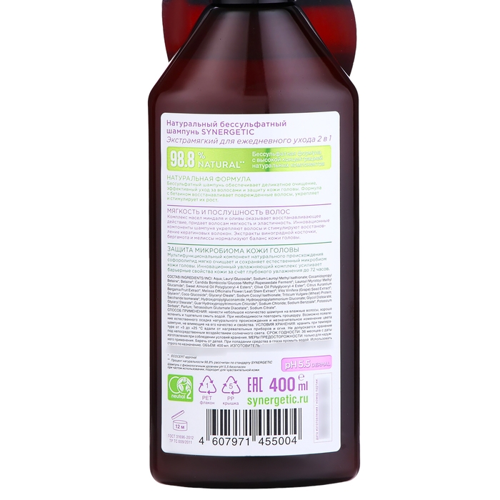 Шампунь натуральный экстрамягкий SYNERGETIC для ежедневного ухода, 400 мл