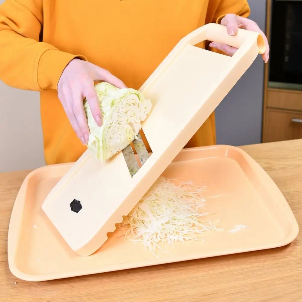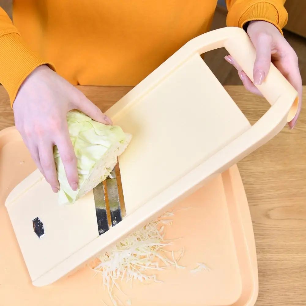 Шинковка удобна в использовании: одной рукой зафиксируйте корпус, а второй, надавливая на капусту, аккуратно режьте движениями вперед. В результате вы без особых усилий получите тонко нарезанную капусту. Также можно аккуратно порезать тонкими ломтиками морковь, огурец, кабачок, баклажан.