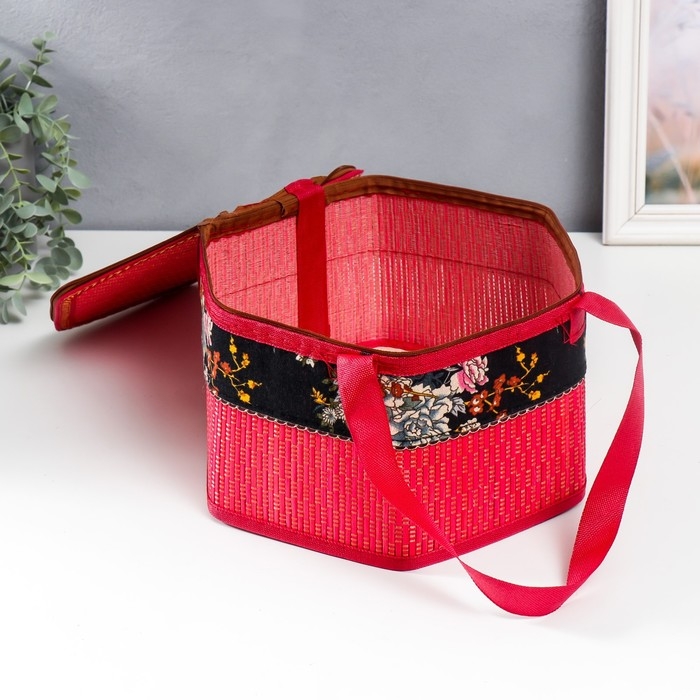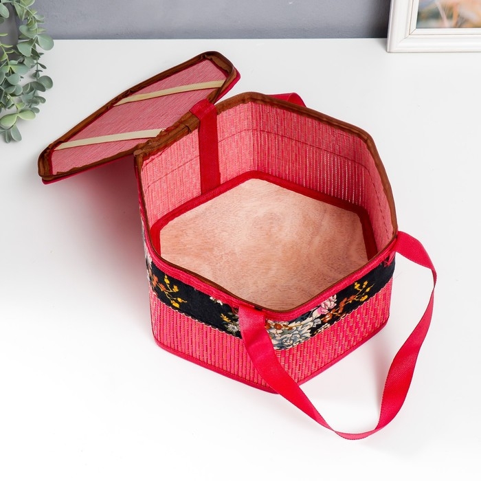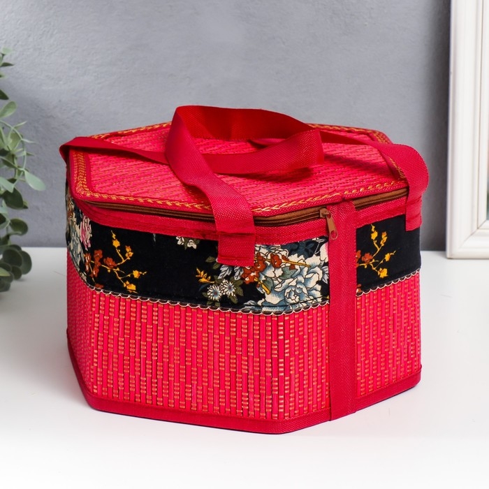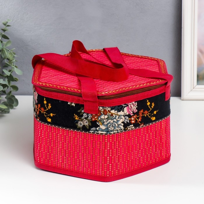 Шкатулка бамбук "Цветы на чёрном" красная, с ручками, молния 16х24х28 см