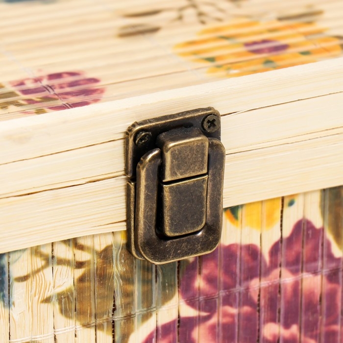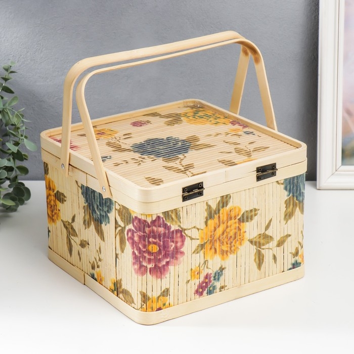 Шкатулка бамбук "Сад с пионами" квадрат, с ручками 16х24х24 см
